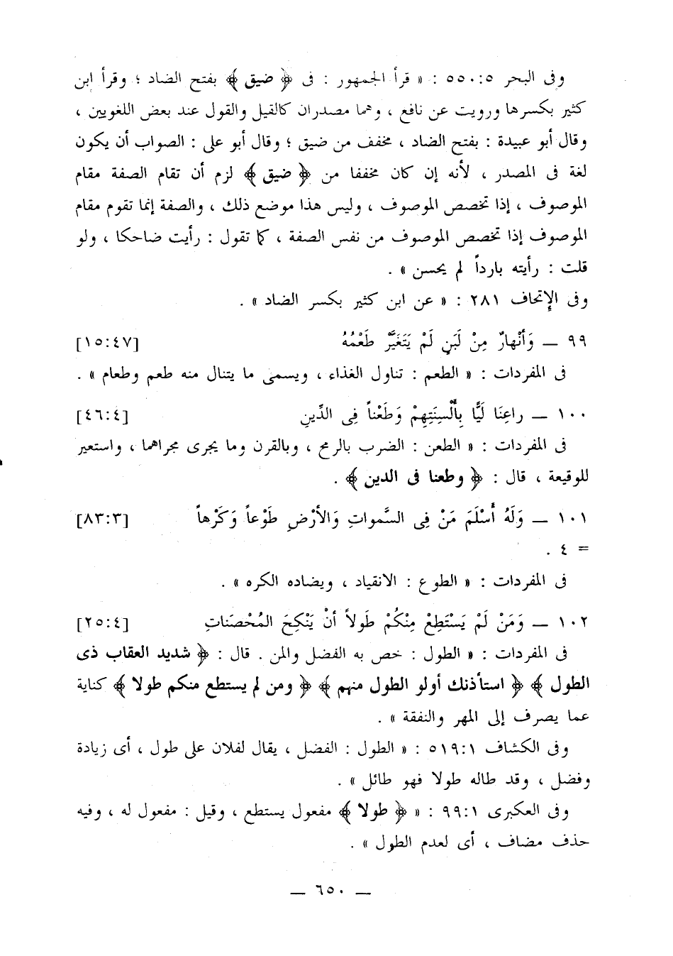 وفي البحر 5: 550: «قرأ الجمهور: في {ضيق} بفتح الضاد؛ وقرأ ابن كثير بكسرها ورويت عن نافع، وهما مصدران كالقيل والقول عند بعض اللغويين، وقال أبو عبيدة: بفتح الضاد، مخفف من ضيق؛ وقال أبو علي: الصواب أن يكون لغة في المصدر، لأنه إن كان مخففا من {ضيق} لزم أن تقام الصفة مقام الموصوف، إذا تخصص الموصوف، وليس هذا موضع ذلك، والصفة إنما تقوم مقام الموصوف إذا تخصص الموصوف من نفس الصفة، كما تقول: رأيت ضاحكا، ولو قلت: رأيته باردا لم يحسن».