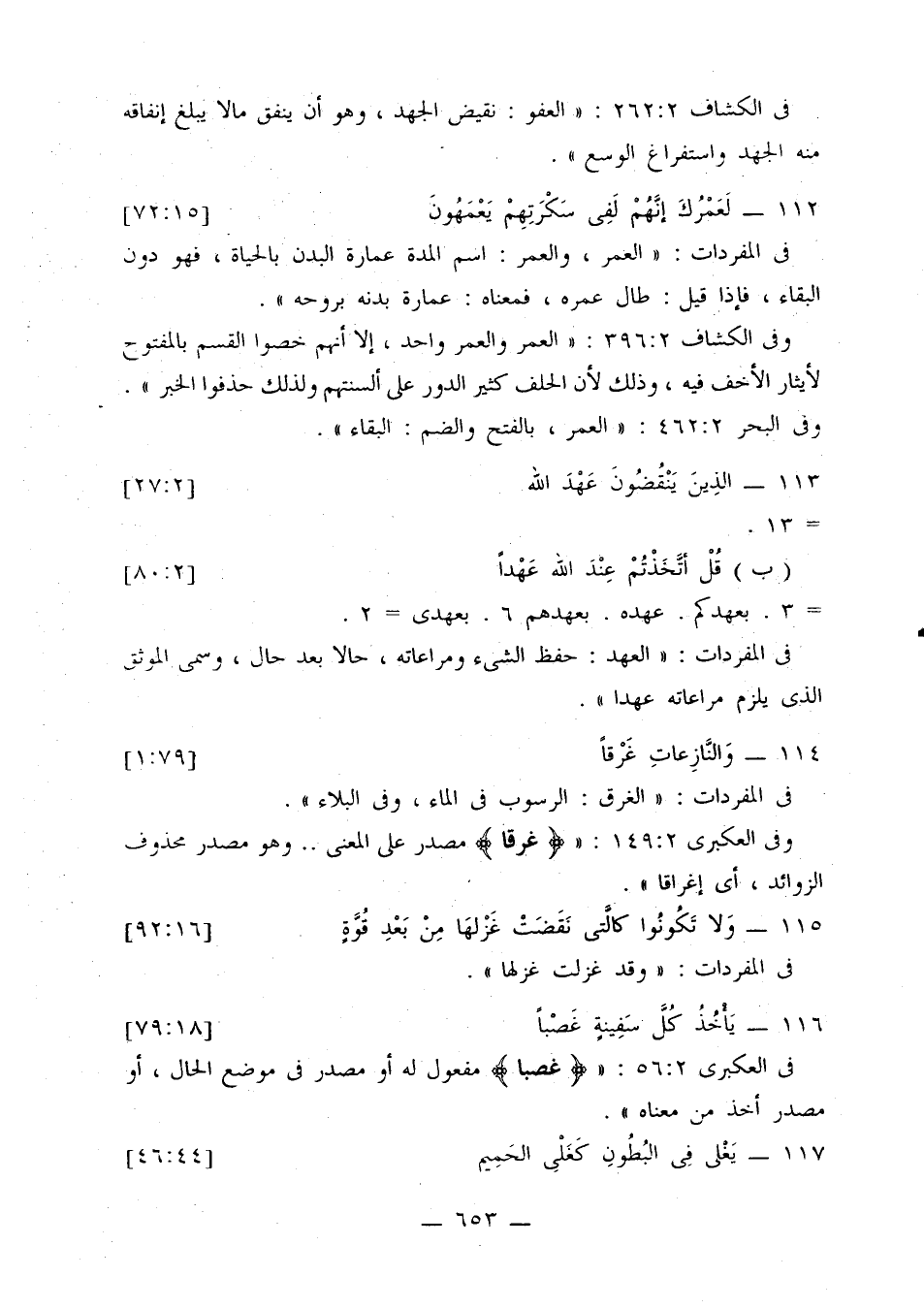 وفي الكشاف 2: 396: «العمر والعمر واحد، إلا أنهم خصوا القسم بالمفتوح لإيثار الأخف فيه، وذلك لأن الحلف كثير الدور على ألسنتهم ولذلك حذفوا الخبر».