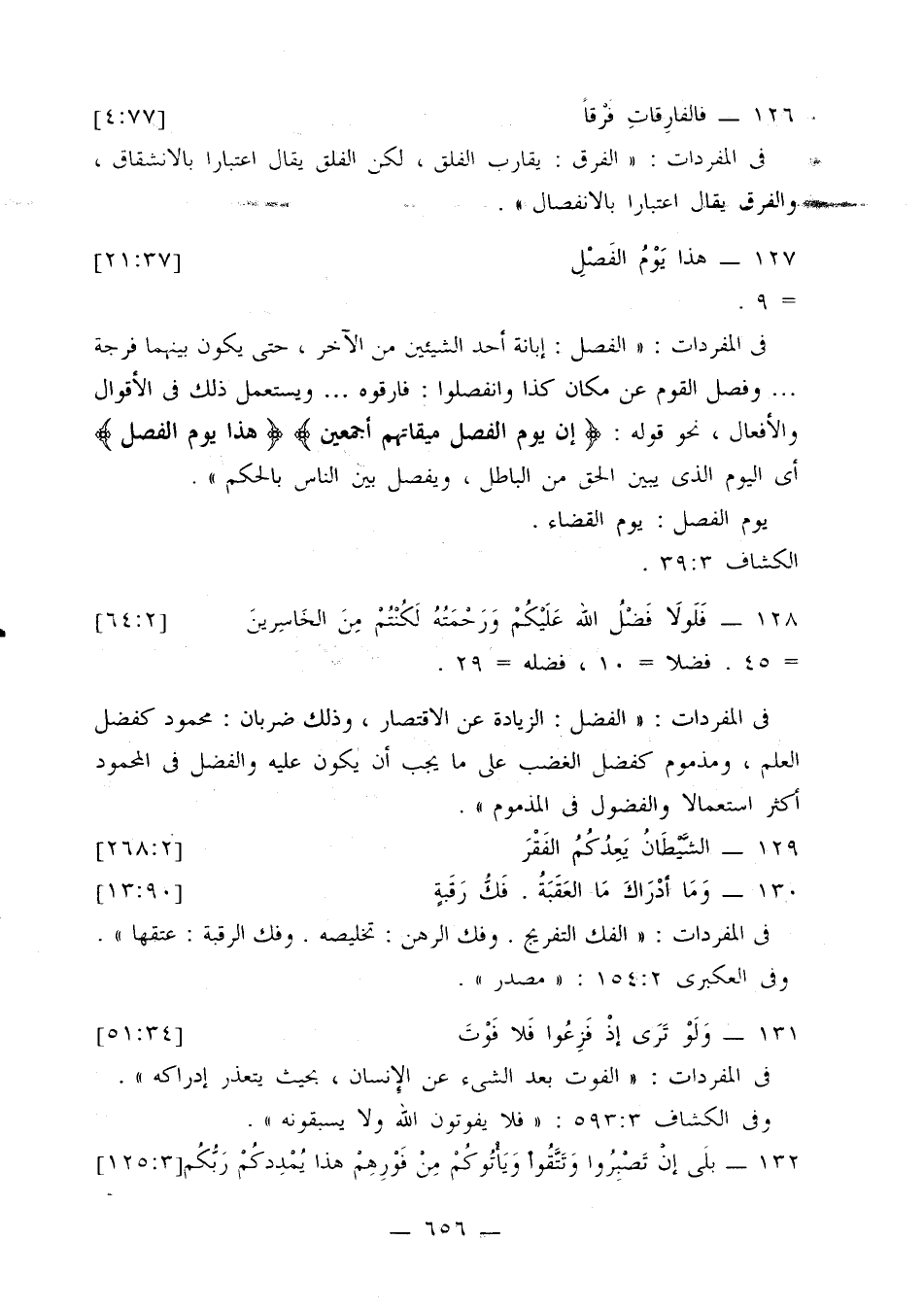 في المفردات: «الفصل: إبانة أحد الشيئين من الآخر، حتى يكون بينهما فرجة ... وفصل القوم عن مكان كذا وانفصلوا: فارقوه ... ويستعمل ذلك في الأقوال والأفعال، نحو قوله: {إن يوم الفصل ميقاتهم أجمعين} {هذا يوم الفصل} أي اليوم الذي يبين الحق من الباطل، ويفصل بين الناس بالحكم».