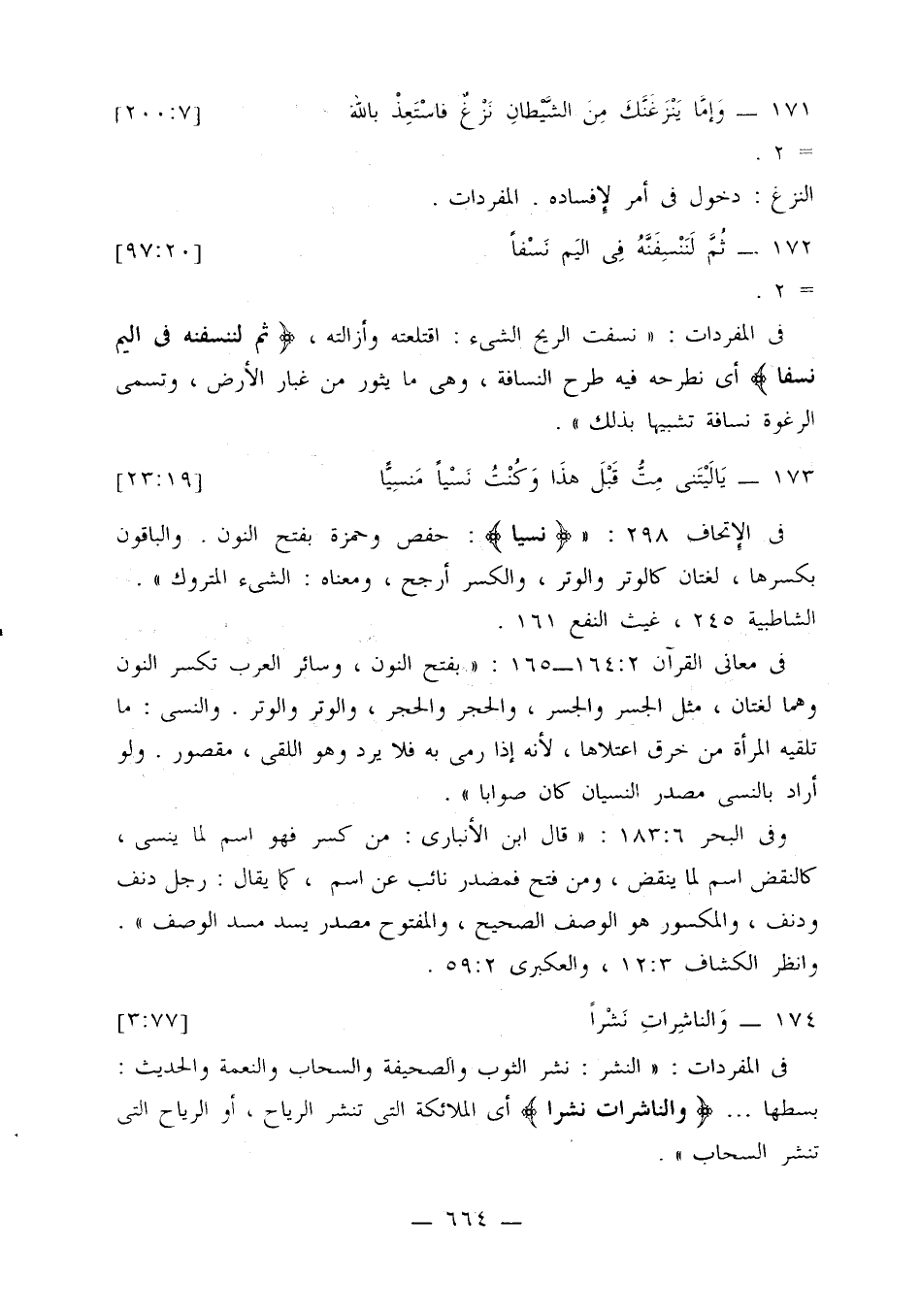 وفي البحر 6: 183: «قال ابن الأنباري: من كسر فهو اسم لما ينسى، كالنقض اسم لما ينقض، ومن فتح فمصدر نائب عن اسم، كما يقال: ردل دنف ودنف، والمكسور هو الوصف الصحيح، والمفتوح مصدر يسد مسد الوصف».