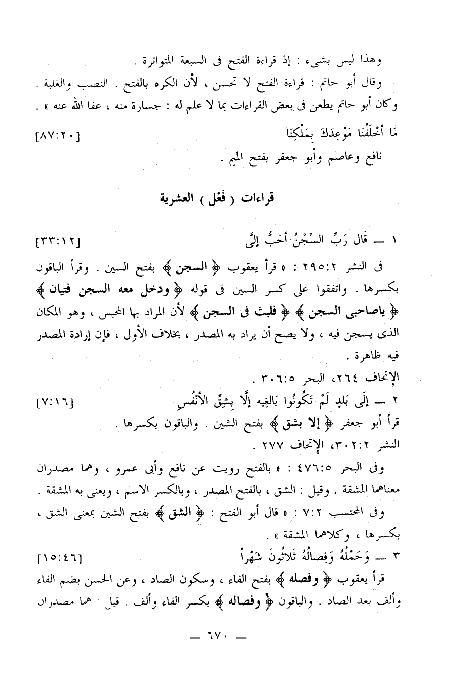 في النشر 2: 295: «قرأ يعقوب {السجن} بفتح السين. وقرأ الباقون بكسرها. واتفقوا على كسر السين في قوله {ودخل معه السجن فتيان} {يا صاحبي السجن} {فلبث في السجن} لأن المراد بها المحبس، وهو المكان الذي يسجن فيه، ولا يصح أن يراد به المصدر، بخلاف الأول، فإن إرادة المصدر فيه ظاهرة.