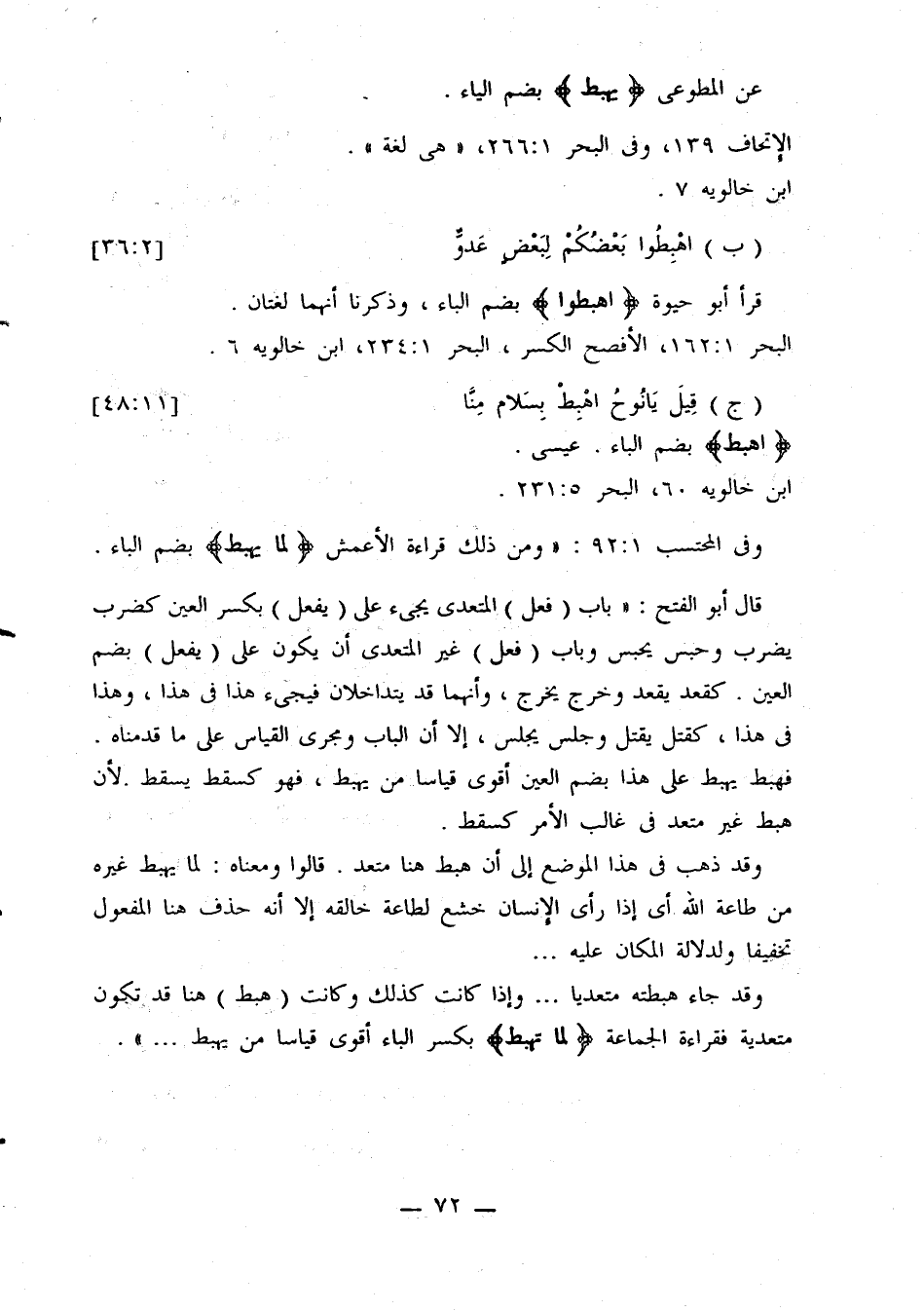 وقد جاء هبطته متعديا ... وإذا كانت كذلك وكانت (هبط) هنا قد تكون متعدية فقراءة الجماعة {لما يهبط} بكسر الباء أقوى قياسا من يهبط ...».
