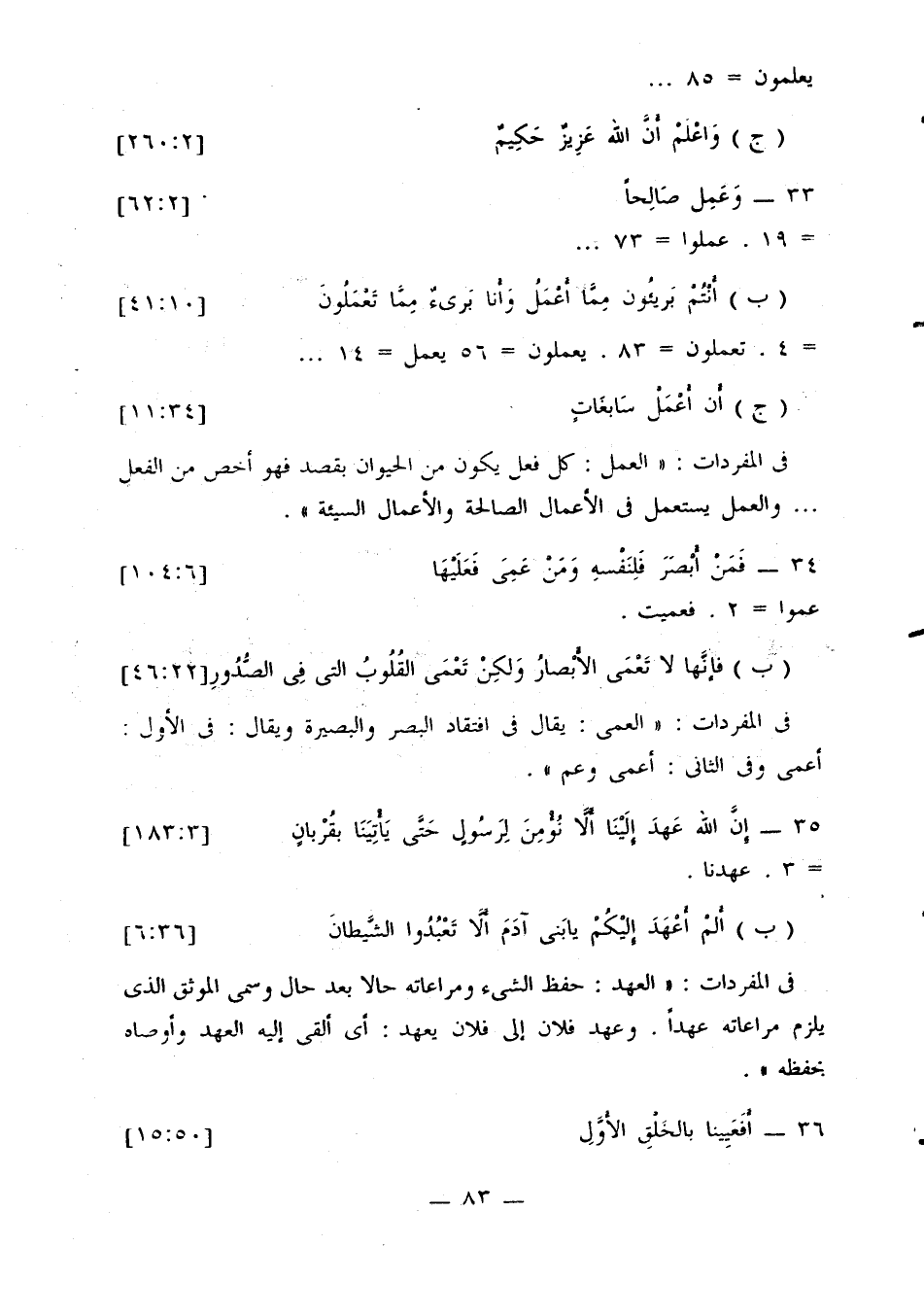 في المفردات: «العمل: كل فعل يكون من الحيوان بقصد فهو أخص من الفعل ... والعمل يستعمل في الأعمال الصالحة والأعمال السيئة».