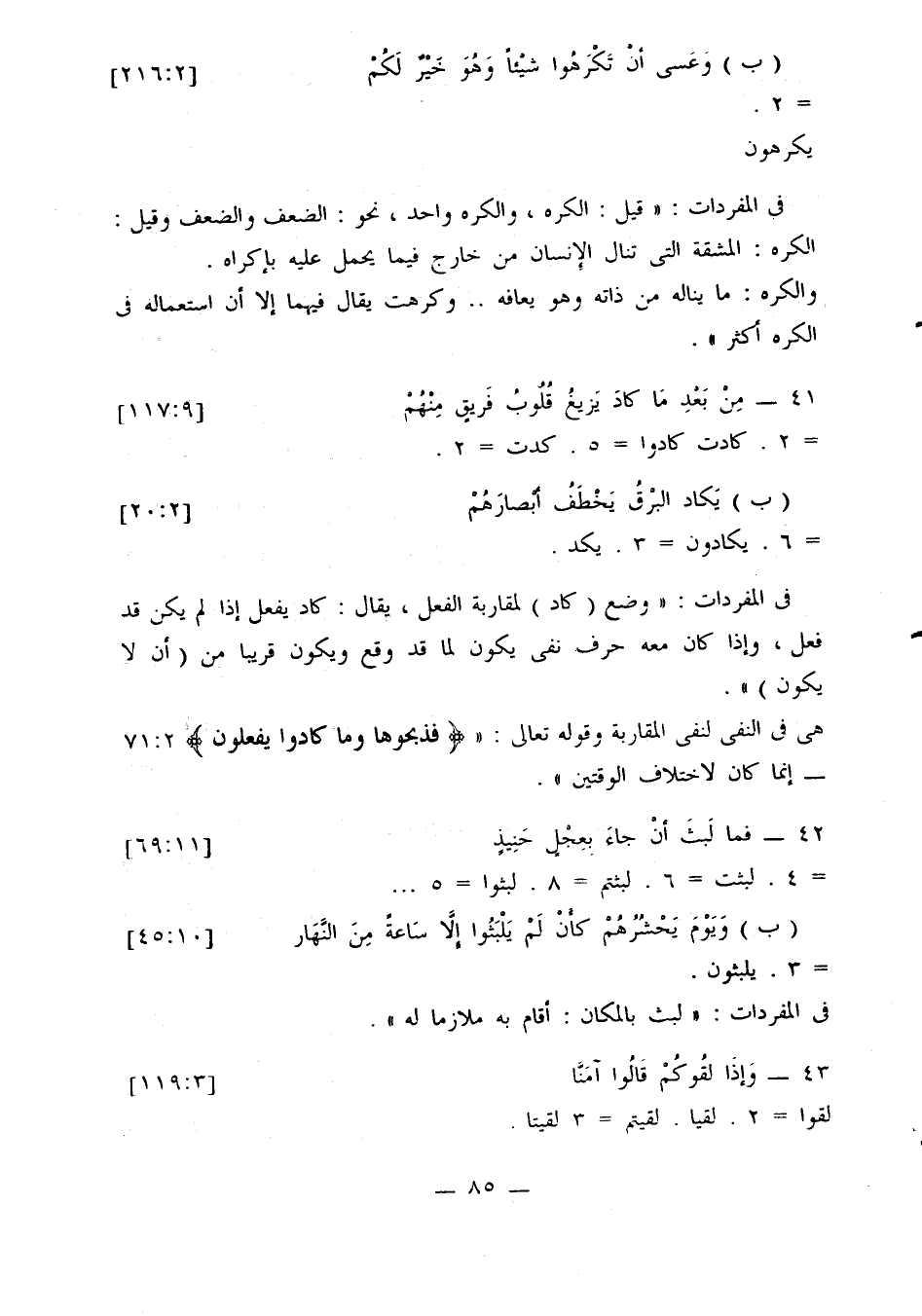 هي في النفي لنفي المقاربة وقوله تعالى: «{فذبحوها وما كادوا يفعلون} 2: 71 - إنما كان لاختلاف الوقتين».