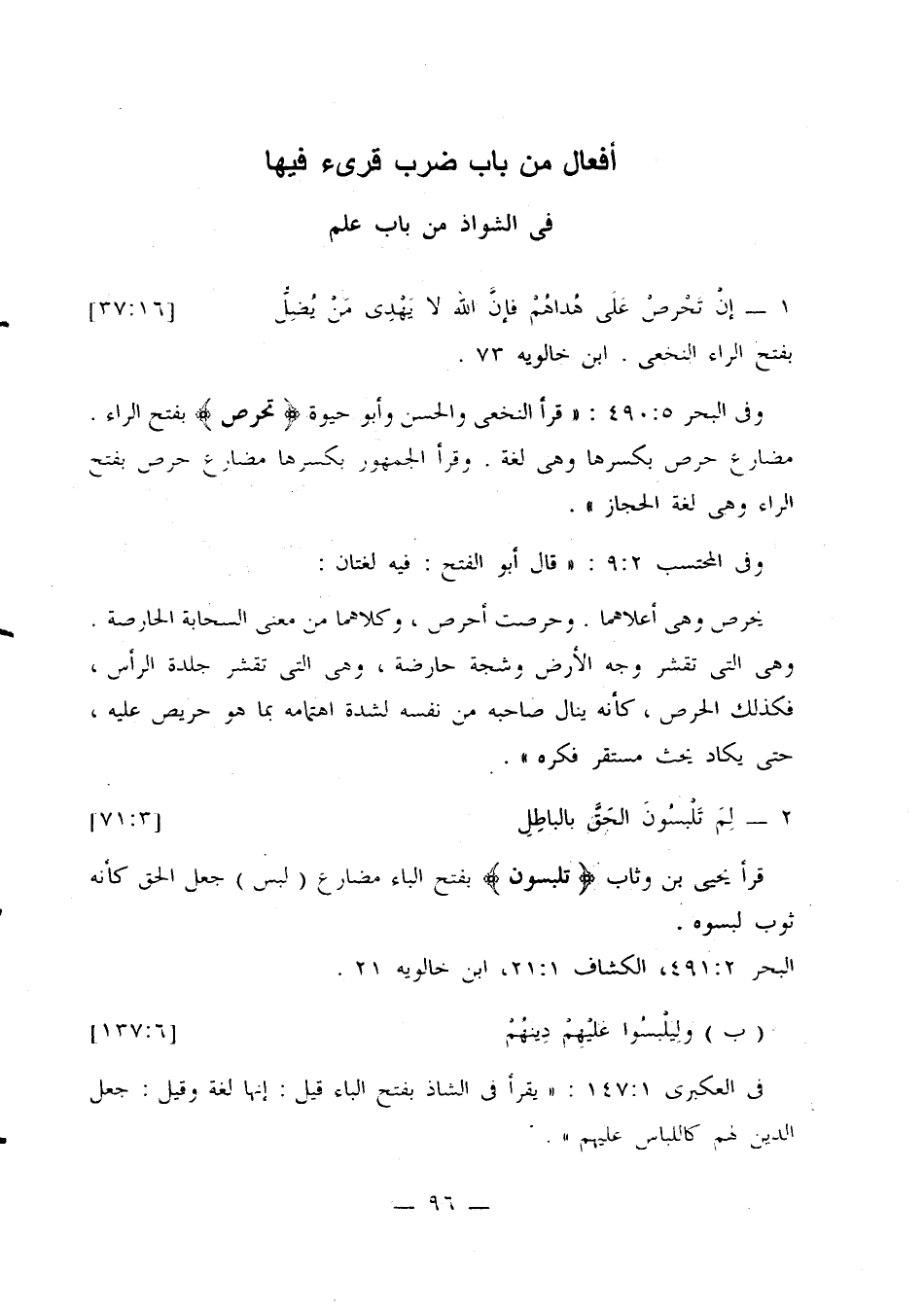 وفي البحر 5: 490: «قرأ النخعي والحسن وأبو حيوة {تحرص} بفتح الراء. مضارع حرص بكسرها وهي لغة. وقرأ الجمهور بكسرها مضارع حرص بفتح الراء وهي لغة الحجاز».