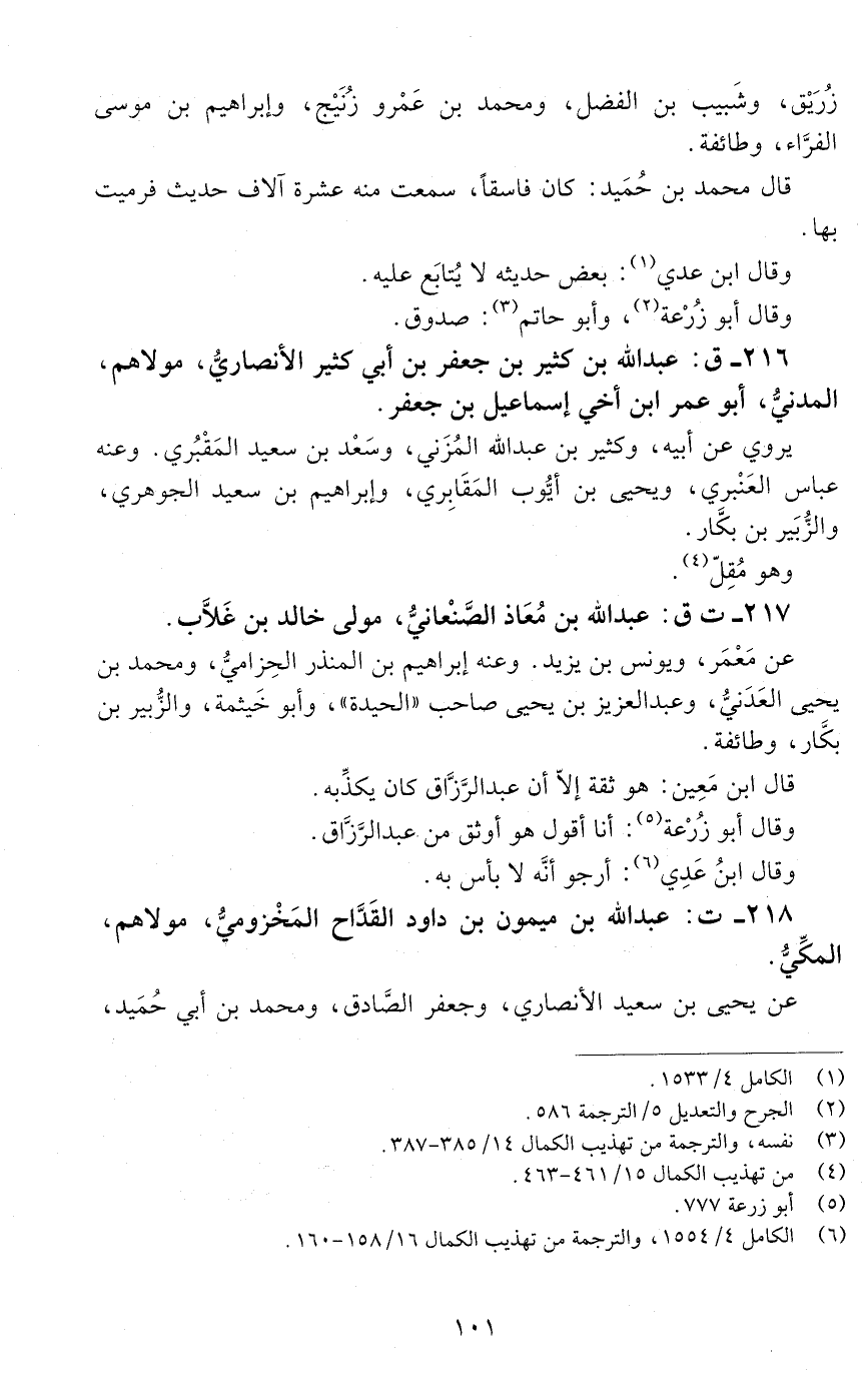 216 - ق: عَبْد اللَّه بْن كثير بْنُ جَعْفَرِ بْنِ أَبِي كَثِيرٍ الأَنْصَارِيُّ، مَوْلاهُمُ الْمَدَنِيّ، أبو عُمَر [الوفاة: 201 - 210 ه]