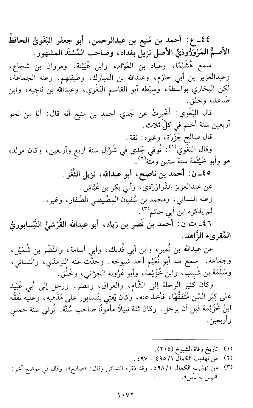 44 - ع: أحمد بن منيع بن عبد الرحمن، أبو جعفر البغوي الحافظ الأصم المَرْوَرُّوذيُّ الأصل [الوفاة: 241 - 250 ه]