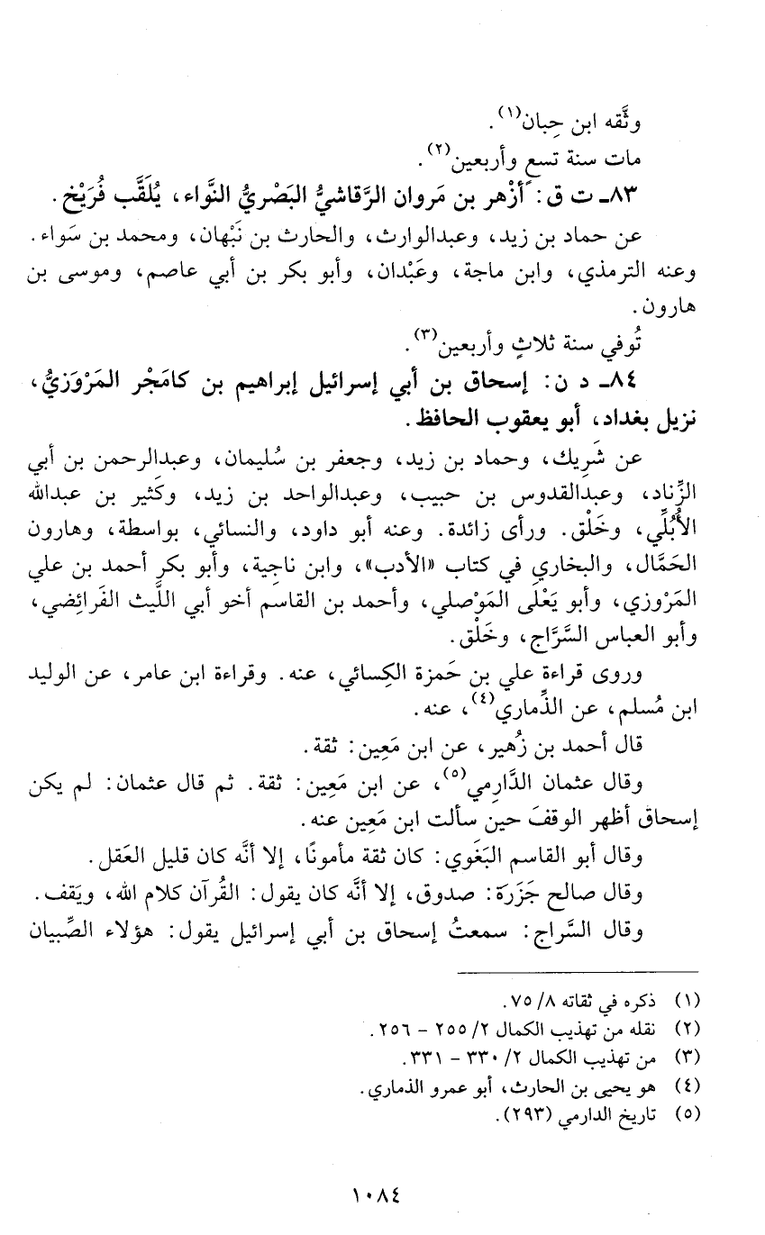 84 - د ن: إسحاق بن أبي إسرائيل إبراهيم بن كامَجْر المروزي، نزيل بغداد، أبو يعقوب الحافظ. [الوفاة: 241 - 250 ه]