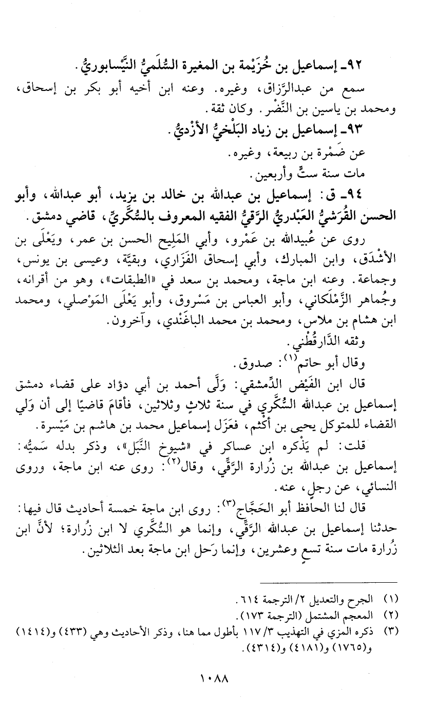94 - ق: إسماعيل بْنُ عَبْدِ اللَّهِ بْنِ خَالِدِ بْنِ يَزِيدَ، أبو عبد الله، وأبو الحسن القرشي العَبْدريُّ الرقي الفقيه المعروف بالسُّكَّريِّ. [الوفاة: 241 - 250 ه]