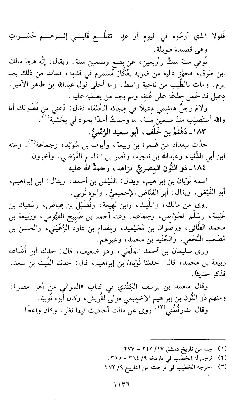 184 - ذو النُّون المِصْريُّ الزّاهد، رحمةُ الله عليه. اسمه ثوبان بن إبراهيم، ويقال: الفيض بن أحمد، ويقال: ابن إبراهيم أبو الفَيْض، ويقال: أبو الفيّاض الإِخميميّ. [الوفاة: 241 - 250 ه]