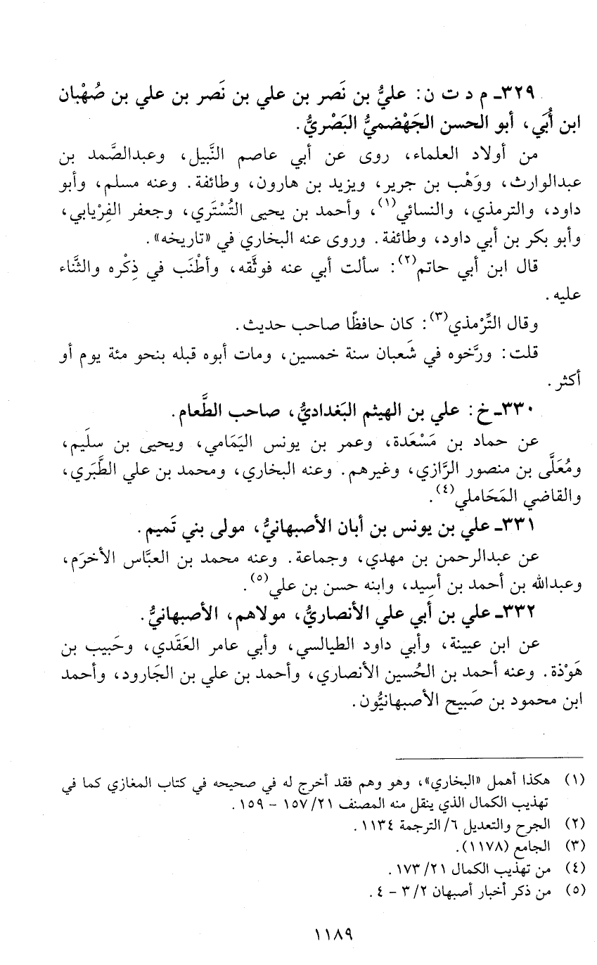 329 - م د ت ن: عليّ بن نصر بن عليّ بن نصر بن عليّ بن صُهْبان بن أُبيّ، أبو الحسن الجهضمي الْبَصْرِيُّ. [الوفاة: 241 - 250 ه]