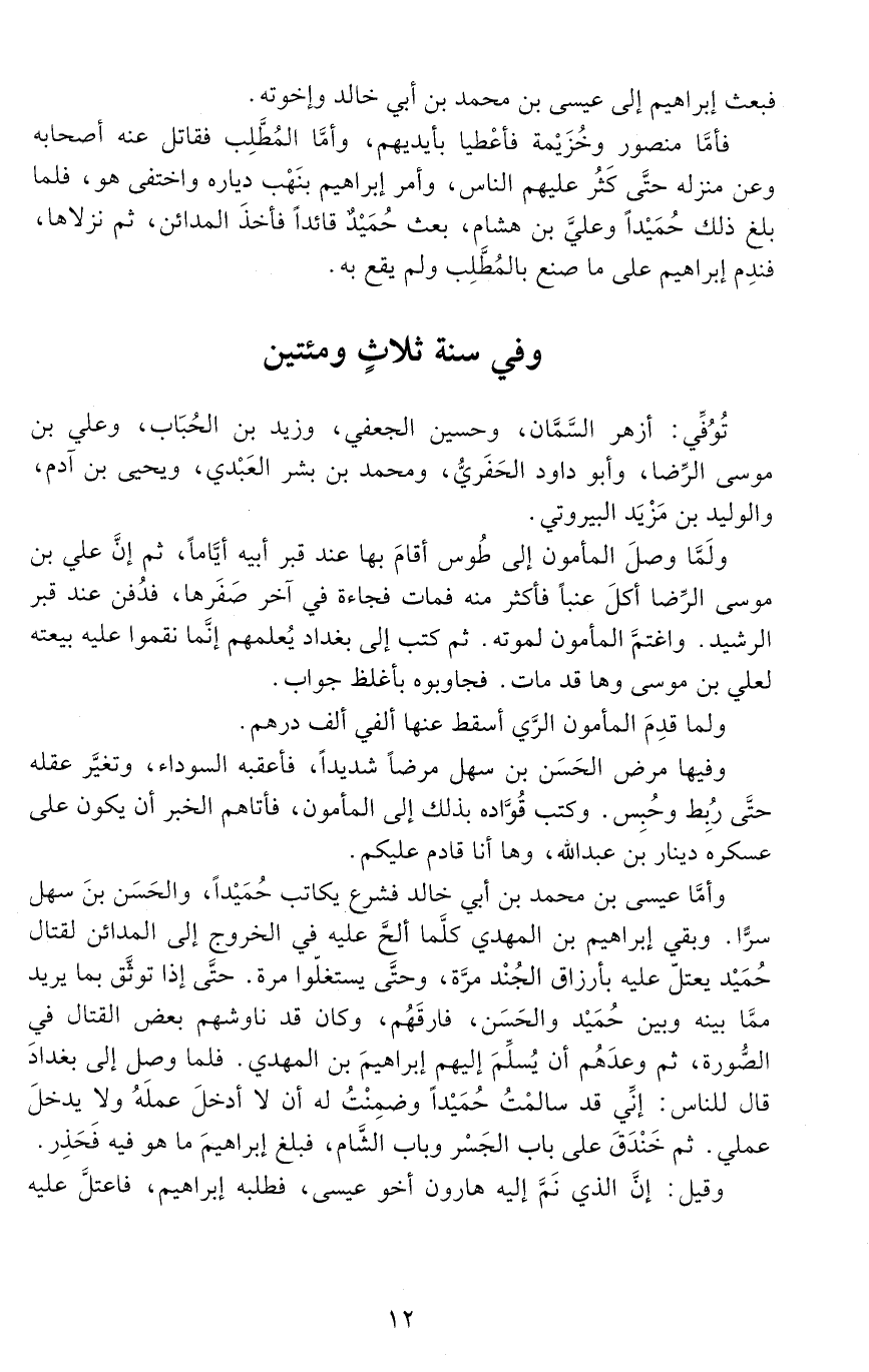 وقيل: إنّ الّذي نم إِلَيْهِ هارون أخو عيسى، فطلبه إبراهيم، فاعتل عليه -[13]- عيسى. ثمّ ألح عَلَيْهِ في المجيء، فأتاه، فحبسه بعد معاتبةٍ بينهما، وبعد أنّ ضربه وحبس معه عدة من قواده في آخر شوّال. فمضى بقية أصحابه ومواليه بعضهم إلى بعض، وحرضوا إخوته عَلَى إبراهيم بْن المهديّ، فتجمعوا، وكان رأسهم عَبَّاس نائب عيسى، فطردوا كل عاملٍ لإبراهيم في الكرخ وغيره. ثمّ شدوا على عامل باب الجسر فطردوه. فدخل إلى إبراهيم وقطع الجسر. ثمّ ظهر الأوباش والشطار.