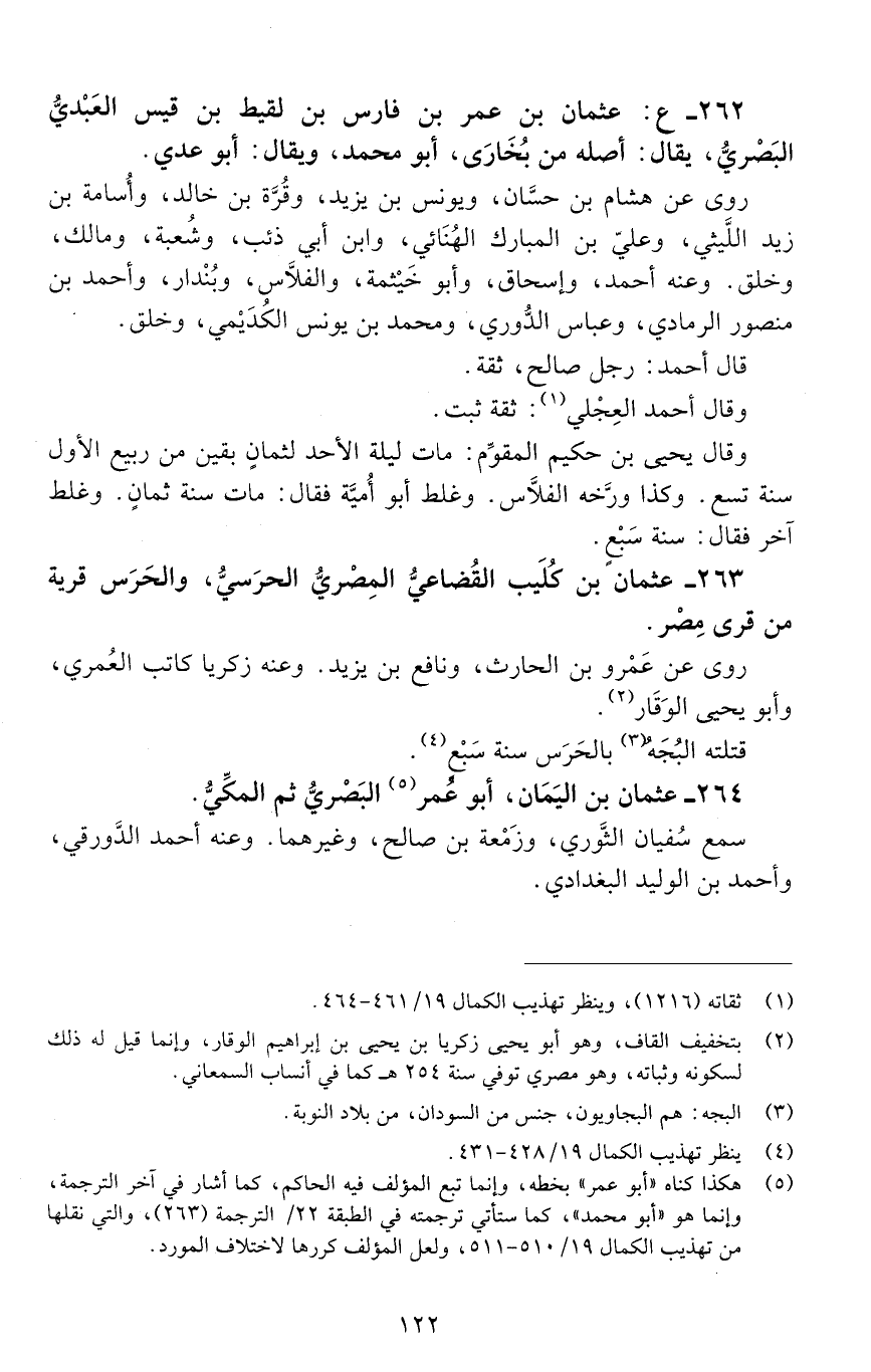 262 - ع: عثمان بْن عُمَر بْن فارس بْن لقيط بْن قيس العبْديّ الْبَصْرِيّ، يُقَالُ: أصله من بخارى، أبو محمد ويقال: أبو عدي. [الوفاة: 201 - 210 ه]