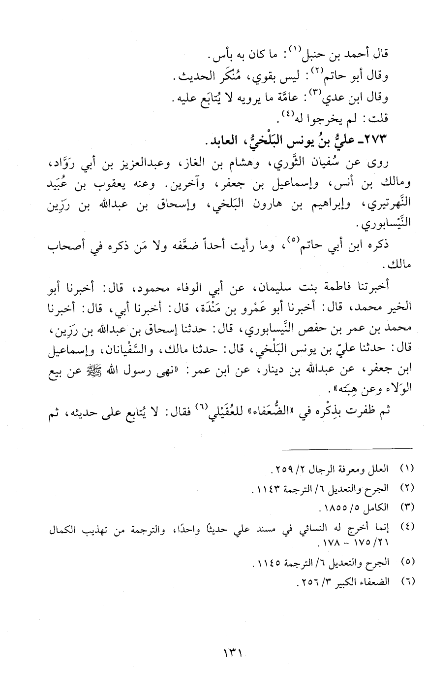 ثمّ ظفرت بذكره في " الضعفاء " للعقيلي، فقال: لا يُتابَع على حديثه، ثمّ -[132]- ساق من رواية الفضل بْن سهل الأعرج، عَنْ عليّ بْن يونس حديثًا، معروف المَتْن، غريب السند.