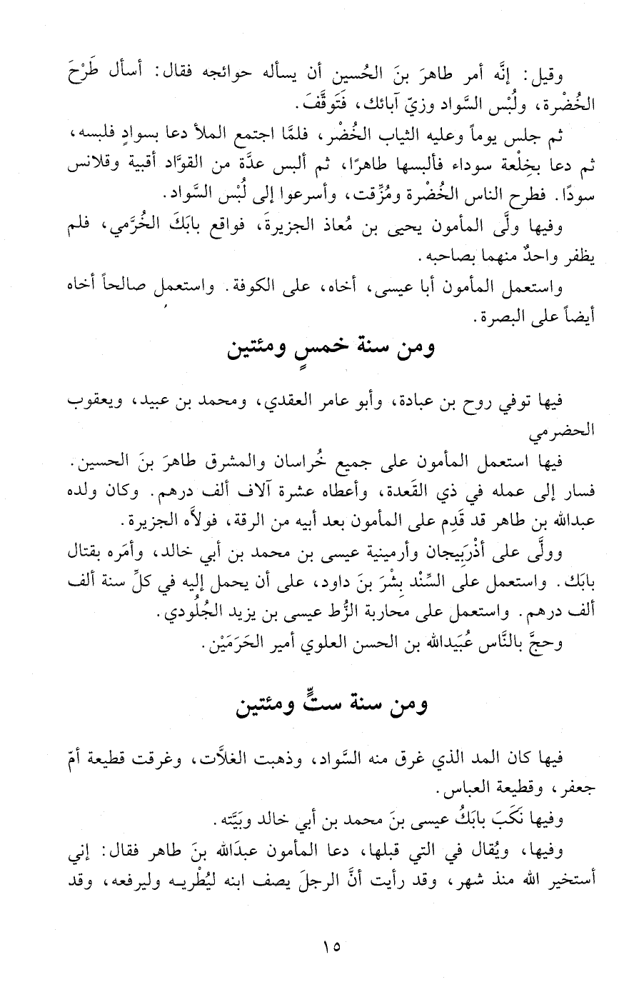 وفيها - ويقال في الّتي قبلها - دعا المأمون عبد الله بن طاهر فقال: إني أستخير اللَّه منذ شهر، وقد رأيت أنّ الرجل يصف ابنه ليطريه وليرفعه. وقد -[16]- رأيتك فوق ما وصفك أبوك. وقد مات يحيى بْن مُعَاذ واستخلف ابنه أحمد وليس بشيء. وقد رأيت تَوْلِيَتَك مصر، ومُحاربةَ نَصْر بْن شَبَث. فقال: السَّمعُ والطاعة، وأرجو أنّ يجعل اللَّه الخيرة لأمير المؤمنين. فعقد له لواء مكتوبا عليه فزاد فيه المأمون: " يا منصور ". وركب الفضل بْن الربيع إلى داره تكرمة له.
