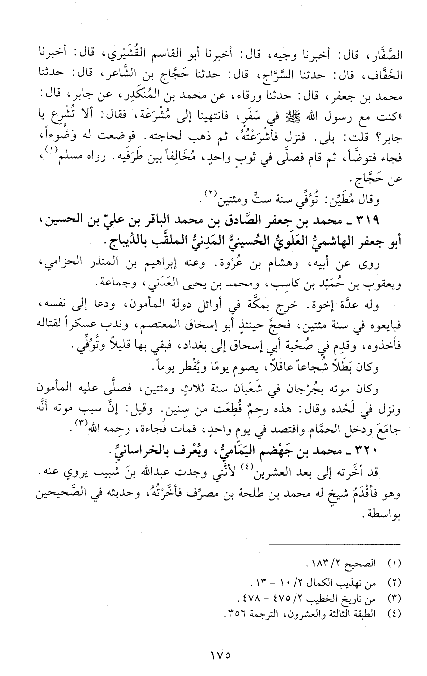 319 - محمد بْن جعفر الصّادق بْن محمد الباقر بْن عليّ بْن الحُسين، أبو جعفر الهاشمي العلوي الحسيني المدني، الملقّب بالديباج. [الوفاة: 201 - 210 ه]