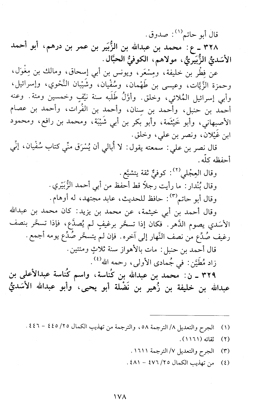 328 - ع: محمد بْن عَبْد اللَّه بْن الزُّبَيْر بْن عُمَر بْن درهم، أبو أحمد الأَسَديّ الزبيري، مولاهم، الكُوفيُّ الحبّال. [الوفاة: 201 - 210 ه]