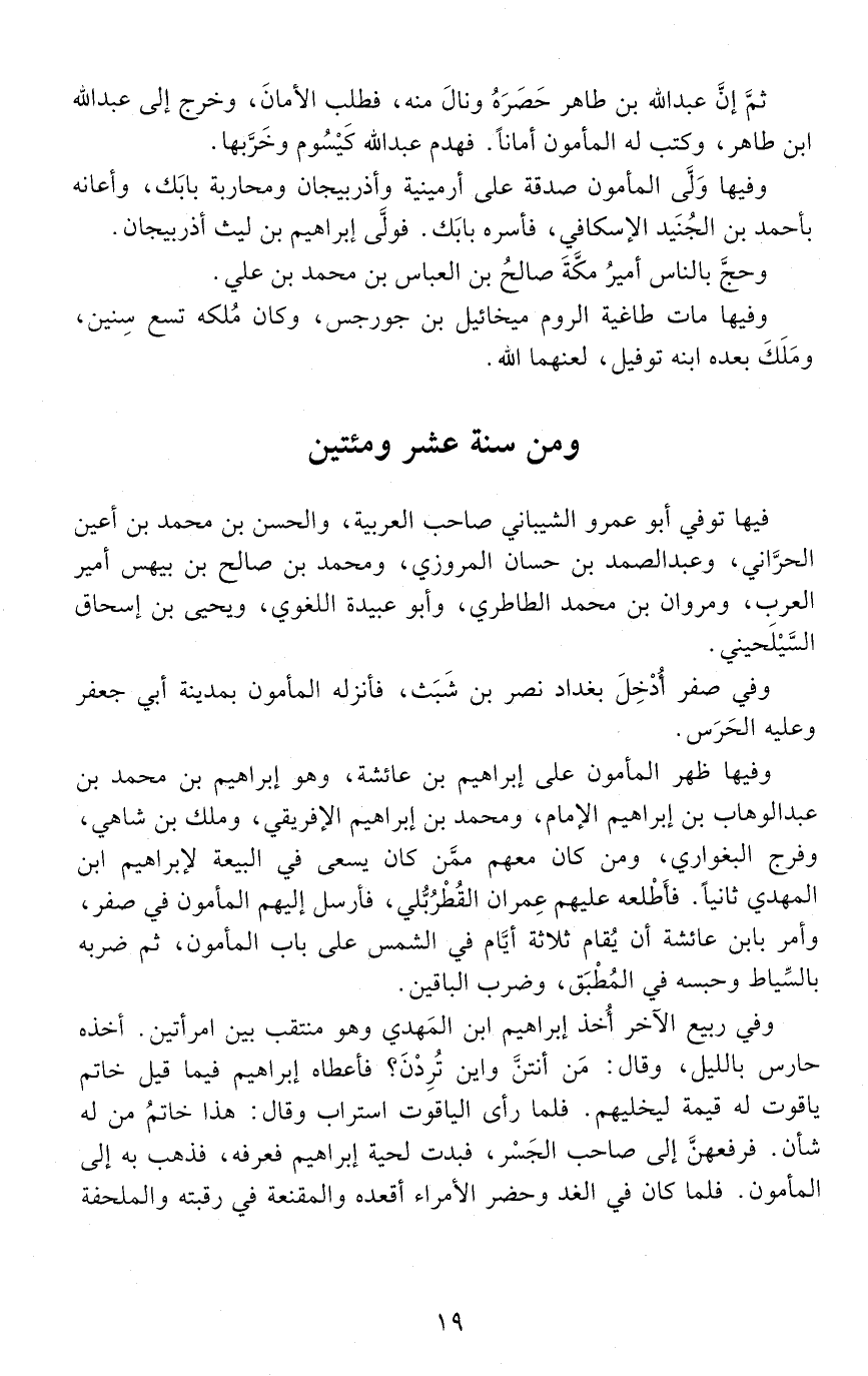 وفي ربيع الآخر أخذ إبراهيم ابن المَهديّ وهو منتقب بين امرأتين. أخذه حارس بالليل، وقال: من أنتنَّ وأين تُرِدْنَ؟ فاعطاه إبراهيم فيما قِيلَ خاتم ياقوت له قيمة ليخليهم. فلما رأى الياقوت استراب وقال: هذا خاتم من لَهُ شأن، فرفعهنّ إلى صاحب الجسر، فبدت لحية إِبْرَاهِيم فعرفه، فذهب بِهِ إلى المأمون. فلمّا كَانَ في الغد، وحضر الأمراء أقعده والمقنعة في رقبته والملحفة -[20]- عَلَى جسده يوهنه بذلك. ثمّ إنّ الحَسَن بْن سهل كلّمه فيه، فرضي عَنْهُ.