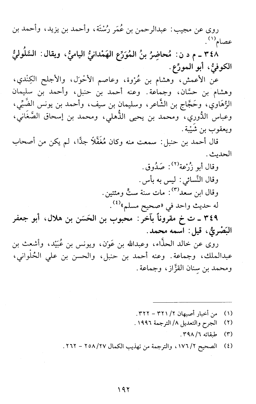 348 - م د ن: مُحاضِرُ بْن المُوَرِّع الهَمْدانيّ الياميّ، ويقال: السَّلُوليّ، الكُوفيُّ، أبو المُوَرِّع. [الوفاة: 201 - 210 ه]