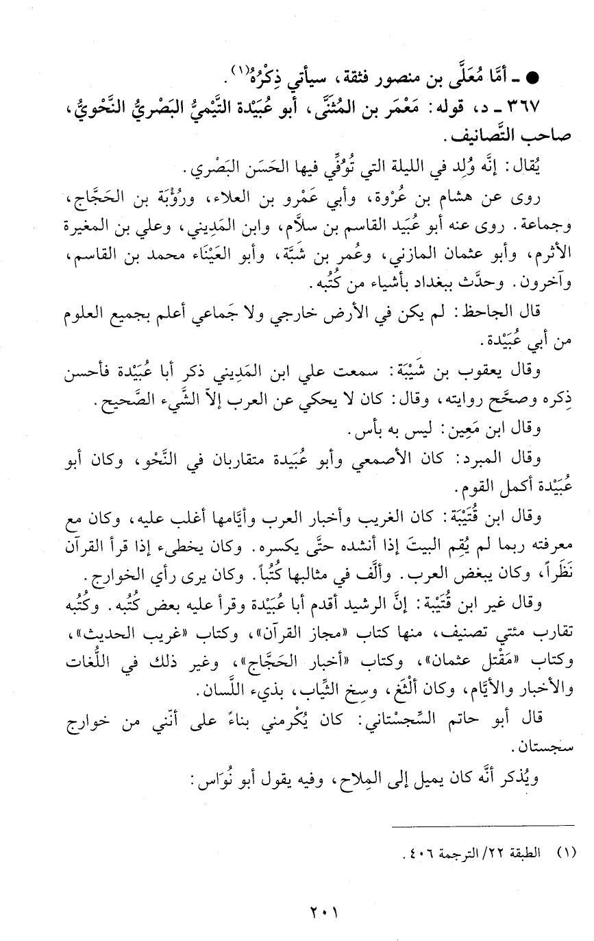 367 - د، قوله: مَعْمَر بْن المُثَنَّى، أبو عبيدة التَّيْميّ الْبَصْرِيّ النَّحْويّ. [الوفاة: 201 - 210 ه]