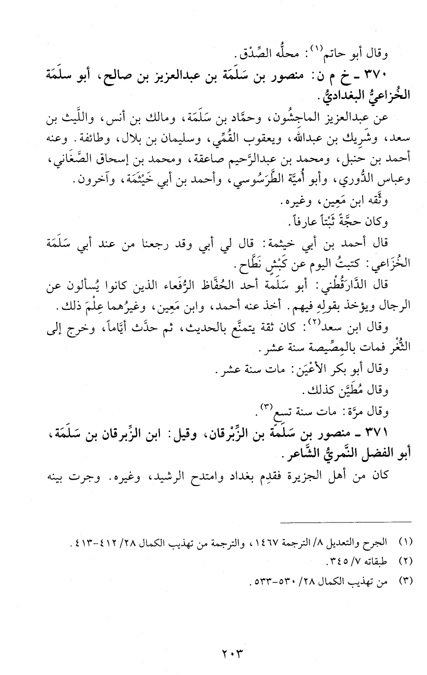 370 - خ م ن: منصور بْن سَلَمَةَ بْن عَبْد العزيز بْن صالح، أبو سلمة الخزاعي البَغْداديُّ. [الوفاة: 201 - 210 ه]