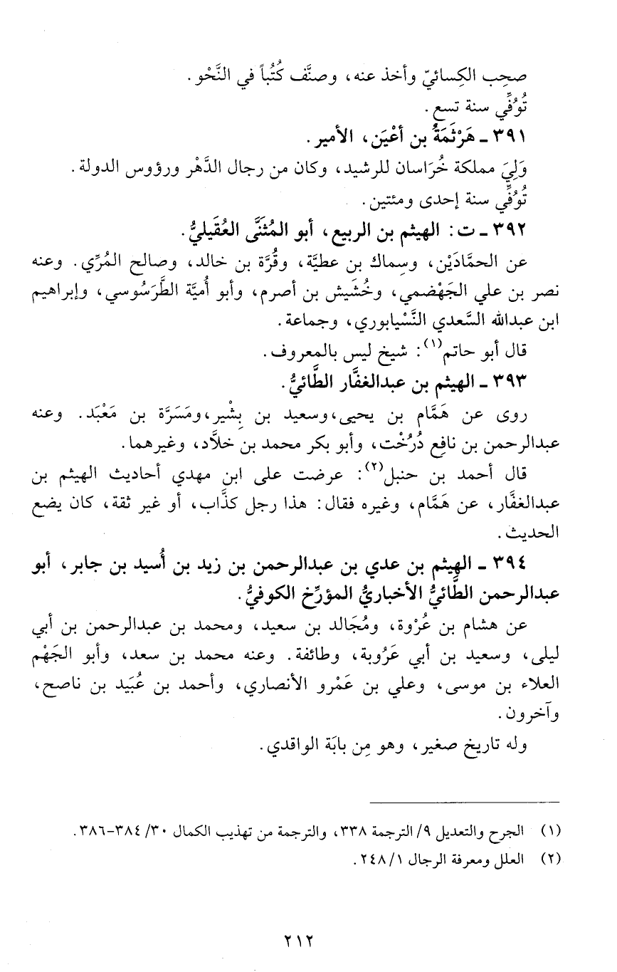394 - الهَيْثَم بْن عديّ بْن عَبْد الرَّحْمَن بْن زيد بْن أُسَيْد بْن جَابِر، أبو عَبْد الرَّحْمَن الطّائيّ الإخباري المؤرخ الكُوفيُّ. [الوفاة: 201 - 210 ه]