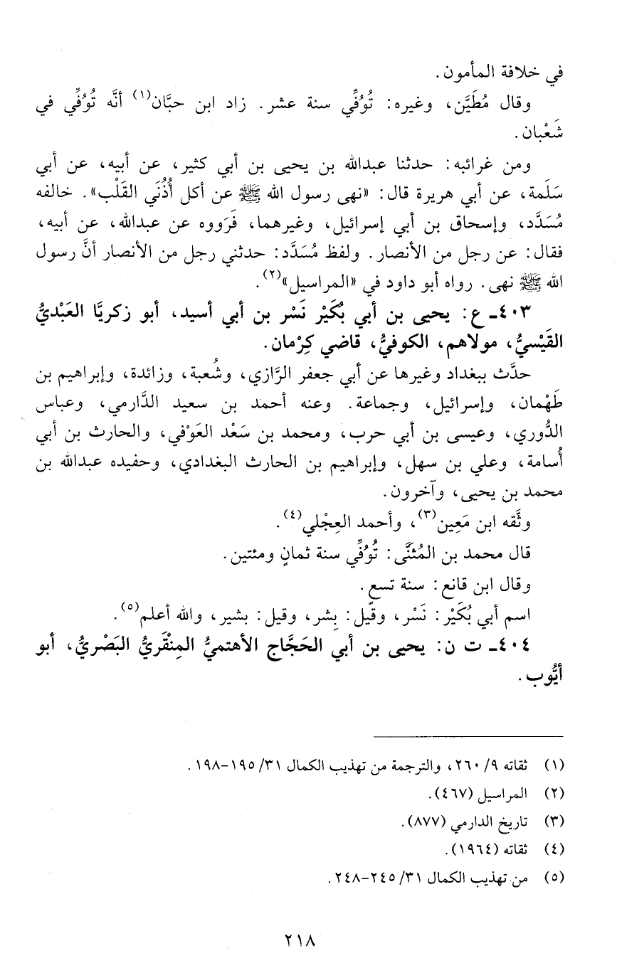403 - ع: يحيى بْن أَبِي بُكَيْر بْن نسر بْن أبي أسيد، أبو زكريا العبدي القيسي، مولاهم الكُوفيُّ، [الوفاة: 201 - 210 ه]