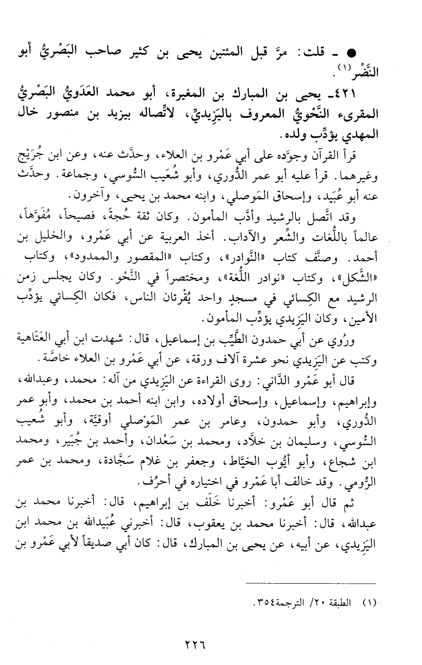 421 - يحيى بْن المبارك بْن المغيرة، أبو محمد العَدَويّ الْبَصْرِيّ المقرئ النَّحْويّ المعروف باليزيديّ؛ [الوفاة: 201 - 210 ه]