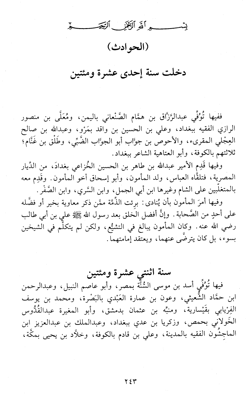 وفيها أظهر المأمون القول بخَلْق القرآن، مُضافًا إلى تفضيل عليّ على أبي بكر، وعمر رضي الله عنهم، فاشْمأزّت النُّفوس منه، ثم سار إلى دمشق فصام بها رمضان، وتوجّه فحجّ بالناس.
