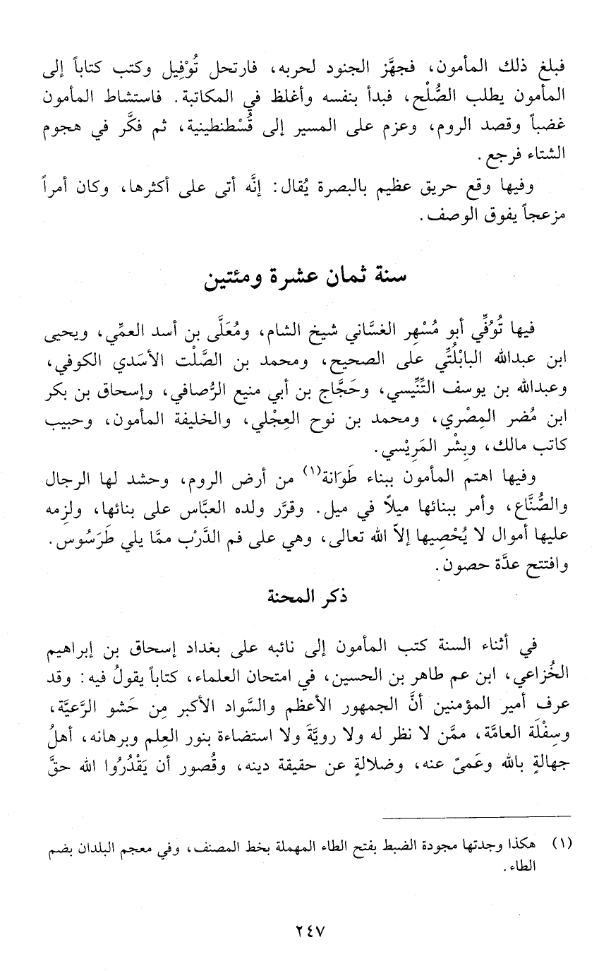 ويقول في الكتاب: فأمّا ما قال بِشْر فقد كذب، لم يكن جرى بين أمير المؤمنين وبينه في ذلك عهد أكثر من إخبار أمير المؤمنين من اعتقاده كلمة الإخلاص، والقول بأنّ القرآن مخلوق، فادعُ به إليك، فإنْ تاب فأَشْهِرْ أمره، وإِنْ أصرّ على شِرْكه، ودفع أن يكون القرآن مخلوقًا بكُفْره وإلحاده فاضربْ عُنُقه، وابعث إلينا برأسه. وكذلك إبراهيم بن المهْدي فامتَحِنْه، فإنْ أجاب، -[250]- وإلّا فاضربْ عُنُقه. وأمّا عليّ بن أبي مقاتل، فقُل له: ألستَ القائل لأمير المؤمنين: إنّك تحلِّل وتحرِّم. وأما الذَّيّال فأَعْلِمْه أنّه كان في الطّعام الذي سرقه من الأنبار ما يشغله. وأمّا أحمد بن يزيد أبو العوّام وقوله: إنّه لَا يُحْسِن الجواب في القرآن، فأَعْلِمْه أنّه صبيُّ في عقله لَا في سِنِّه، جاهلٌ سيُحْسِن الجواب إذا أُدِّب، ثم إنْ لم يفعل كان السيفُ من وراء ذلك. وأمّا أحمد بن حنبل فأَعْلِمْه أنّ أمير المؤمنين قد عرف فحوى مقالته، واستدّل على جَهْله وآفته بها. وأمّا الفضل بن غانم، فأَعلْمِهْ أنّه لم يَخْفَ على أمير المؤمنين ما كان فيه بمصر، وما اكتسب من الأموال في أقل من سنة، يعني في ولايته القضاء. وأمّا الزيادي فأعلمه أنه كان منتحلا ولاء دَعِيٍّ. فأنكر أبو حسّان أن يكون مولى لزياد بن أبيه، وإنّما قيل له: الزّياديّ لأمرٍ من الأمور. قال: وأمّا أبو نصر التّمّار فإنّ أمير المؤمنين شبَّه خساسة عقله بخساسة متجره. وأمّا ابن نوح، وابن حاتم فأعْلِمْهم أنّهم مشاغيل بأكل الرِّبا عن الوقوف على التوحيد، وإنّ أمير المؤمنين لو لم يستحل محاربتهم في الله إلا لآرابهم، وما نزل به كتابُ الله في أمثالهم لَاستحلّ ذلك، فكيف بهم وقد جمعوا مع الإرباء شِرْكًا، وصاروا للنَّصارى شَبَهًا؟ وأمّا ابن شجاع فأعلمه أنه صاحبه بالأمس، والمستخرج منه ما استخرجه من المال الذي كان استحلَّه من مال الأمير عليّ بن هشام. وأمّا سَعدويْه الواسطيّ، فقل له: قبّح الله رجلًا بلغ به التصنُّع للحديث والحرص على الرياسة فيه، أنْ تمنّى وقت المحنة. وأمّا المعروف بسَجّادة، وإنكاره أن يكون سمع ممّن كان يجالس من العلماء القولَ بأنّ القرآن مخلوق، فأَعْلِمْه أنّ في شغله وإعداد النَّوَى، وحُكمه لإصلاح سجّادته، وبالودائع الّتي دفعها إليه عليّ بن يحيى وغيره ما أذهله عن التوحيد. وأما القواريري ففيما تكشف من أحواله، وقبوله الرّشا والمصانعات ما أبان عن مذهبه وسوء طريقته وسخافة عقله ودينه. وأمّا يحيى العُمريّ، فإنْ كان من ولد عمر بن الخطّاب فجوابه معروف. وأمّا محمد بن الحسن بن عليّ بن عاصم، -[251]- فإنّه لو كان مُقْتديًا بمن مضى من سلفه لم ينتحل النِّحْلَةَ التي حُكِيَتْ عنه، وأنّه بعدَ صبيٌّ يحتاج إلى أن يُعلَّم. وقد كان أمير المؤمنين وجّه إليك المعروف بأبي مُسْهِر بعد أن نصّه أمير المؤمنين عن محنته في القرآن، فجمجم عنها ولَجْلج فيها حتّى دعا له أمير المؤمنين بالسيف، فأقرّ ذميمًا، فأَنْصِصْه عن إقراره، فإنْ كان مقيمًا عليه فأشْهِر ذلك وأظْهِرْه. ومَن لم يرجع عن شِرْكه ممّن سمَّيتُ بعد بِشر، وابن المهديّ، فاحمِلْهم موثَّقين إلى عسكر أمير المؤمنين ليسألهم، فإنْ لم يرجعوا حملهم على السيف.