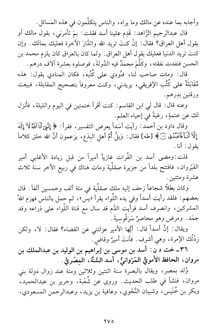 36 - خت د ن: أسد بن موسى بن إِبْرَاهِيمُ بْنُ الْوَلِيدِ بْنِ عَبْدِ الْمَلِكِ بْنِ مروان، الحافظ الأمويّ المَرْوانيّ، أسد السُّنَّةِ، المِصْريُّ. [الوفاة: 211 - 220 ه]