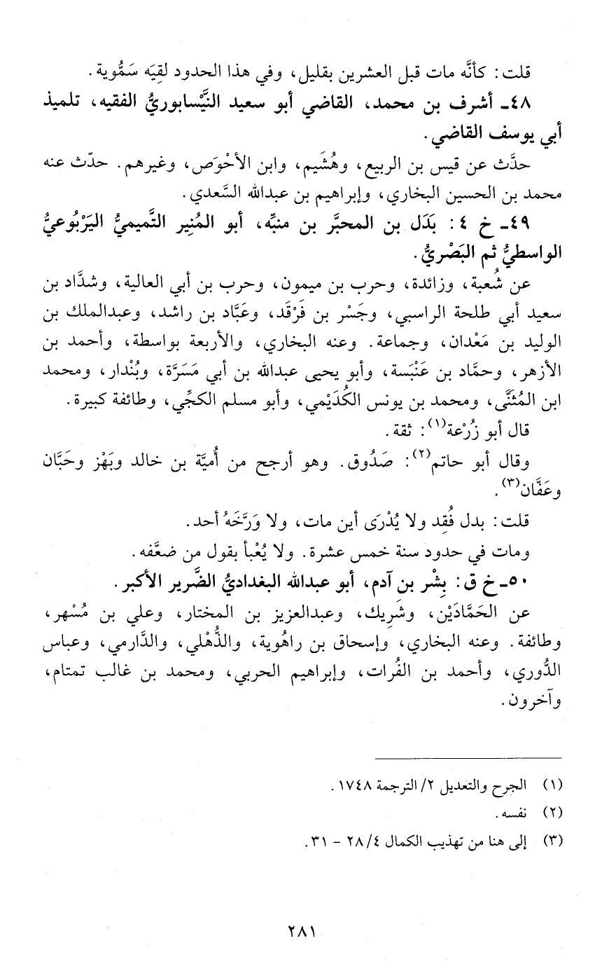 50 - خ ق: بشر بن آدم، أبو عبد الله البَغْداديُّ الضرير الأكبر. [الوفاة: 211 - 220 ه]