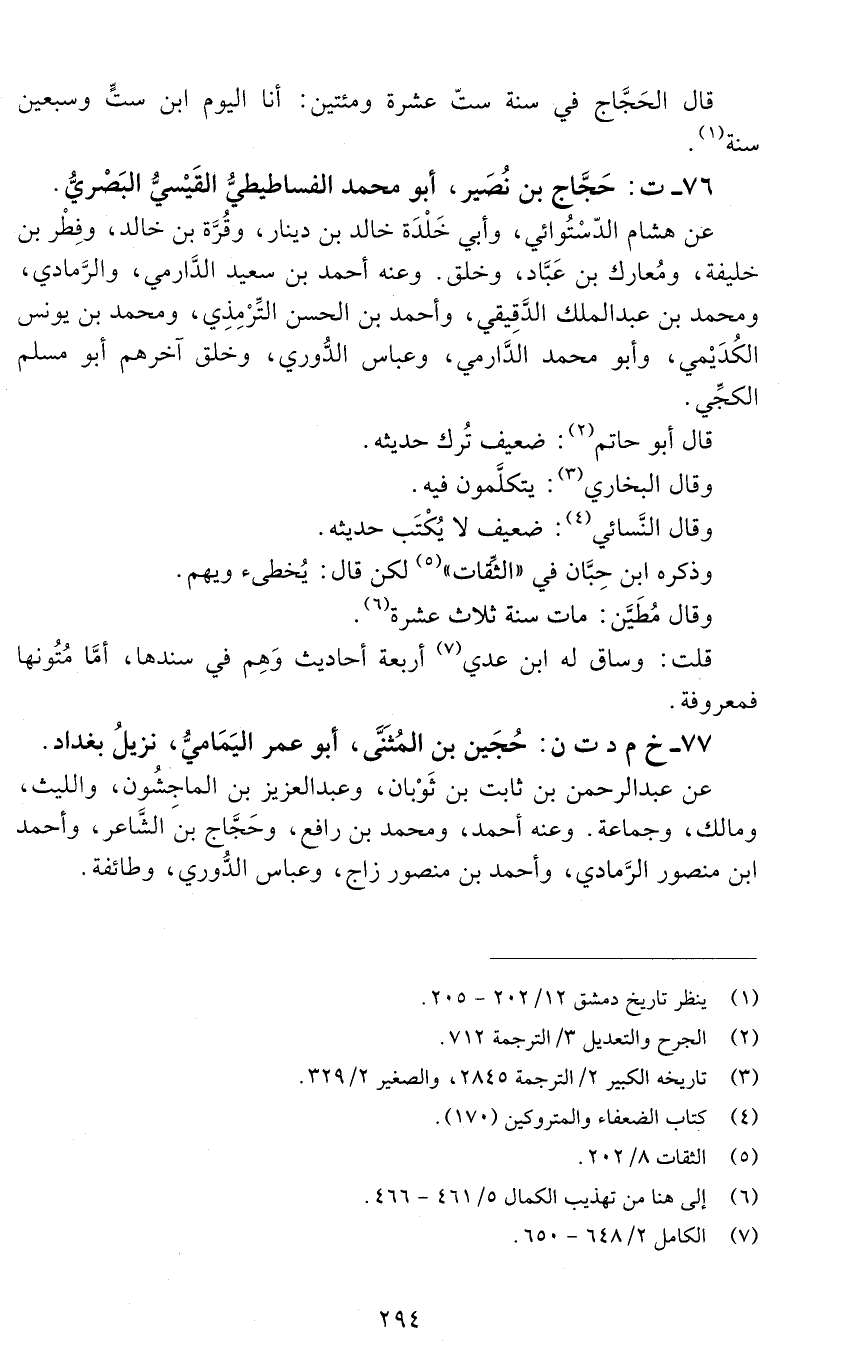 76 - ت: حَجّاج بن نُصَير، أبو محمد الفساطيطيّ القَيْسيّ الْبَصْرِيُّ. [الوفاة: 211 - 220 ه]