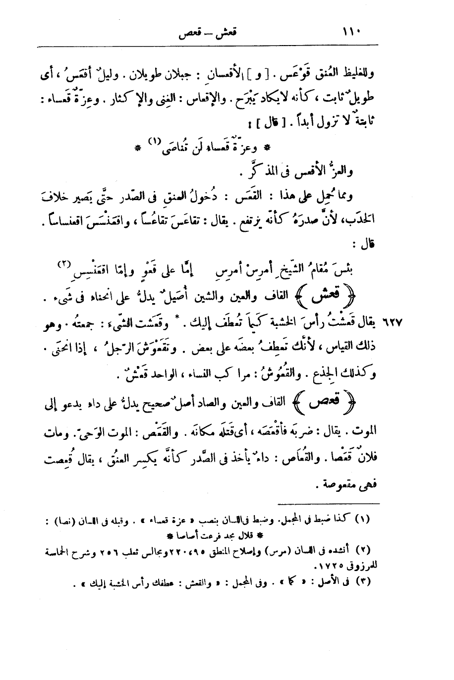 (قَعَصَ) الْقَافُ وَالْعَيْنُ وَالصَّادُ أَصْلٌ صَحِيحٌ يَدُلُّ عَلَى دَاءٍ يَدْعُو إِلَى الْمَوْتِ. يُقَالُ: ضَرَبَهُ فَأَقْعَصَهُ: أَيْ قَتَلَهُ مَكَانَهُ. وَالْقَعَصُ: الْمَوْتُ الْوَحِيُّ. وَمَاتَ فُلَانٌ قَعَْصًا. وَالْقُعَاصُ: دَاءٌ يَأْخُذُ فِي الصَّدْرِ كَأَنَّهُ يَكْسِرُ الْعُنُقَ، يُقَالُ قُعِصَتْ فَهِيَ مَقْعُوصَةٌ.