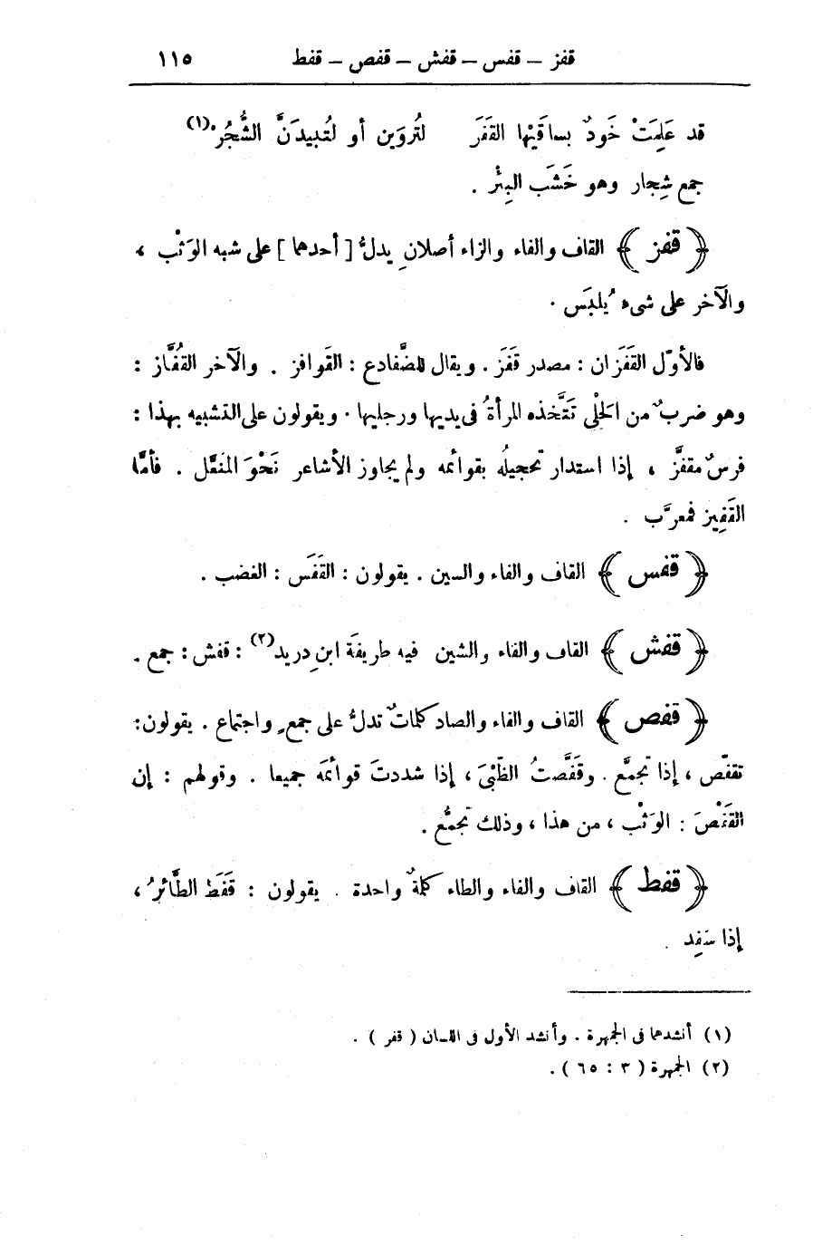 فَالْأَوَّلُ الْقَفَزَانُ: مَصْدَرُ قَفَزَ. وَيُقَالُ لِلضَّفَادِعِ: الْقَوَافِزُ. وَالْآخَرُ الْقُفَّازُ: وَهُوَ ضَرْبٌ مِنَ الْحُلِيِّ تَتَّخِذُهُ الْمَرْأَةُ فِي يَدَيْهَا وَرِجْلَيْهَا. وَيَقُولُونَ عَلَى التَّشْبِيهِ بِهَذَا: فَرَسٌ مُقَفَّزٌ، إِذَا اسْتَدَارَ تَحْجِيلُهُ بِقَوَائِمِهِ وَلَمْ يُجَاوِزِ الْأَشَاعِرَ نَحْوَ الْمُنَعَّلِ. فَأَمَّا الْقَفِيزُ فَمُعَرَّبٌ.