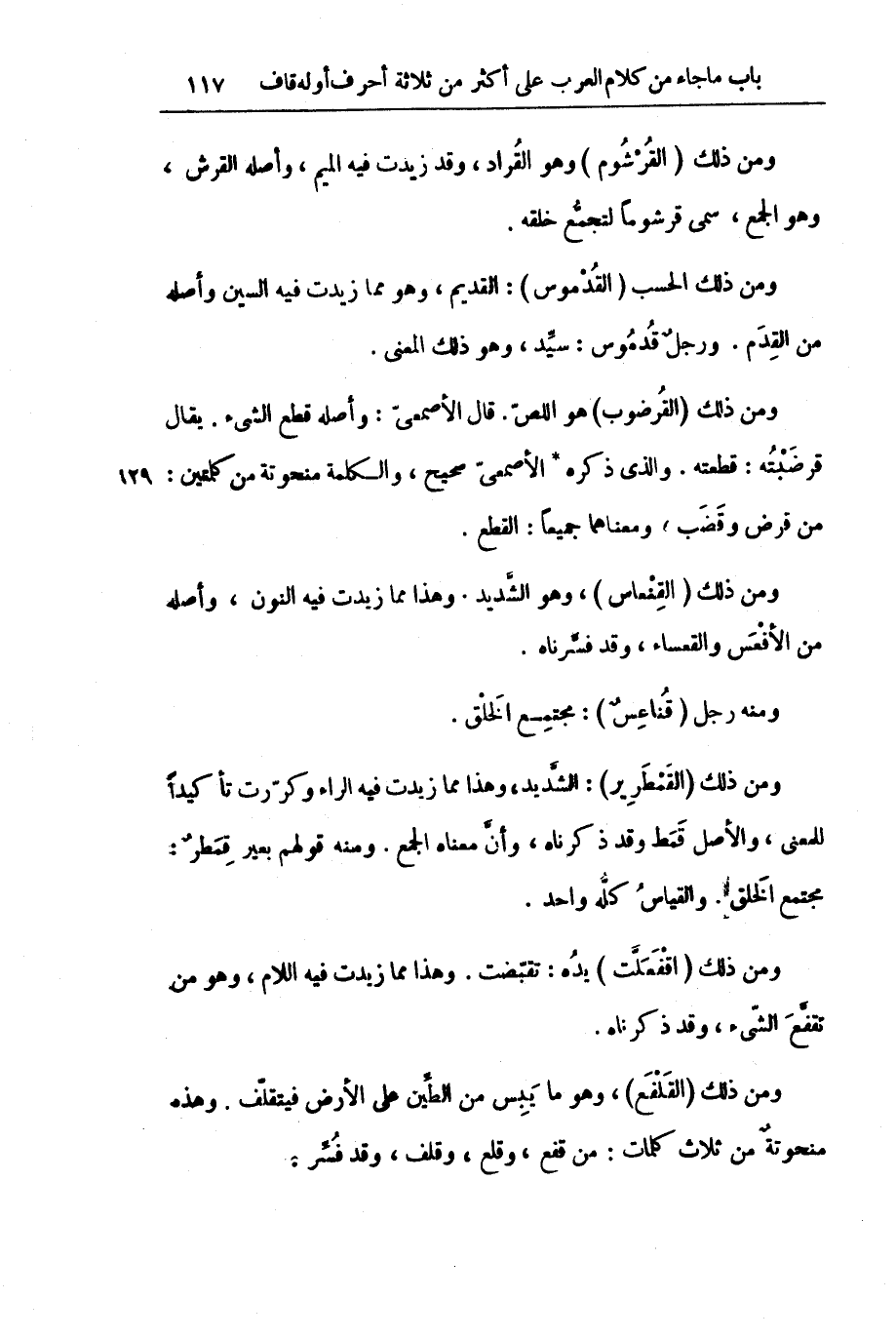 وَمِنْ ذَلِكَ (الْقُرْشُومُ) وَهُوَ الْقُرَادُ، وَقَدْ زِيدَتْ فِيهِ الْمِيمُ، وَأَصْلُهُ الْقِرْشُ، وَهُوَ الْجَمْعُ، سُمِّيَ قَرْشُومًا لِتَجَمُّعِ خَلْقِهِ.