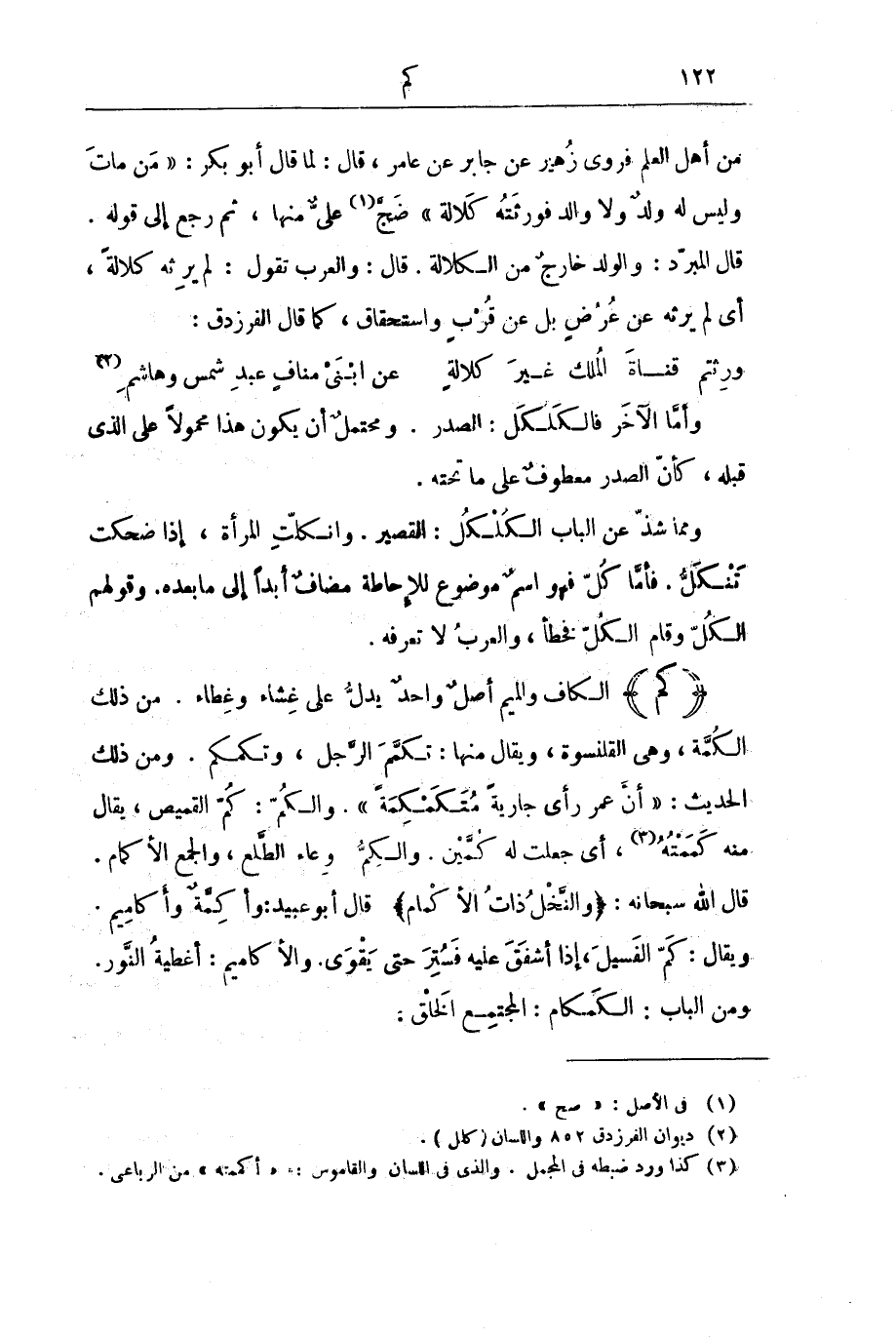 مِنْ أَهْلِ الْعِلْمِ فَرَوَى زُهَيْرٌ عَنْ جَابِرِ بْنِ عَامِرٍ، قَالَ: لَمَّا قَالَ أَبُو بَكْرٍ: " مَنْ مَاتَ وَلَيْسَ لَهُ وَلَدٌ وَلَا وَالِدٌ فَوَرَثَتُهُ كَلَالَةٌ " ضَجَّ عَلِيٌّ مِنْهَا، ثُمَّ رَجَعَ إِلَى قَوْلِهِ. قَالَ الْمُبَرِّدُ: وَالْوَلَدُ خَارِجٌ مِنَ الْكَلَالَةِ. قَالَ: وَالْعَرَبُ تَقُولُ: لَمْ يَرِثْهُ كَلَالَةً، أَيْ لَمْ يَرِثْهُ عَنْ عُرُضٍ بَلْ عَنْ قُرْبٍ وَاسْتِحْقَاقٍ، كَمَا قَالَ الْفَرَزْدَقُ: