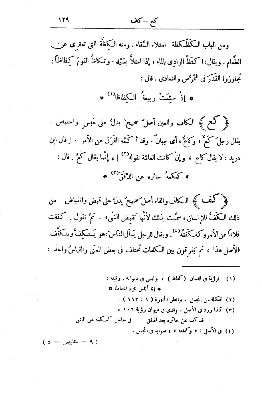 (كَفَّ) الْكَافُ وَالْفَاءُ أَصْلٌ صَحِيحٌ يَدُلُّ عَلَى قَبْضٍ وَانْقِبَاضٍ. مِنْ ذَلِكَ الْكَفُّ لِلْإِنْسَانِ، سُمِّيَتْ بِذَلِكَ لِأَنَّهَا تَقْبِضُ الشَّيْءَ. ثُمَّ تَقُولُ: كَفَفْتُ فُلَانًا عَنِ الْأَمْرِ وَكَفْكَفْتُهُ. وَيُقَالُ لِلرَّجُلِ يَسْأَلُ النَّاسَ: هُوَ يَسْتَكِفُّ وَيَتَكَفَّفُ. الْأَصْلُ هَذَا، ثُمَّ يَفْرِقُونَ بَيْنَ الْكَلِمَاتِ تَخْتَلِفُ فِي بَعْضِ الْمَعْنَى وَالْقِيَاسُ وَاحِدٌ