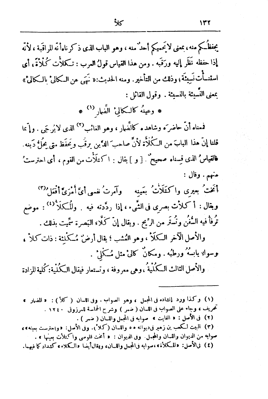 فَمَعْنَاهُ أَنَّ حَاضِرَهُ وَشَاهِدَهُ كَالضِّمَارِ، وَهُوَ الْغَائِبُ الَّذِي لَا يُرْجَى. وَإِنَّمَا قُلْنَا إِنَّ هَذَا الْبَابَ مِنَ الْكُلْأَةِ لِأَنَّ صَاحِبَ الدِّينِ يَرْقُبُ وَيَحْفَظُ مَتَى يَحُلُّ دَيْنُهُ. فَالْقِيَاسُ الَّذِي قِسْنَاهُ صَحِيحٌ. [وَ] يُقَالُ: اكْتَلَأْتُ مِنَ الْقَوْمِ، أَيِ احْتَرَسْتُ مِنْهُمْ. وَقَالَ: