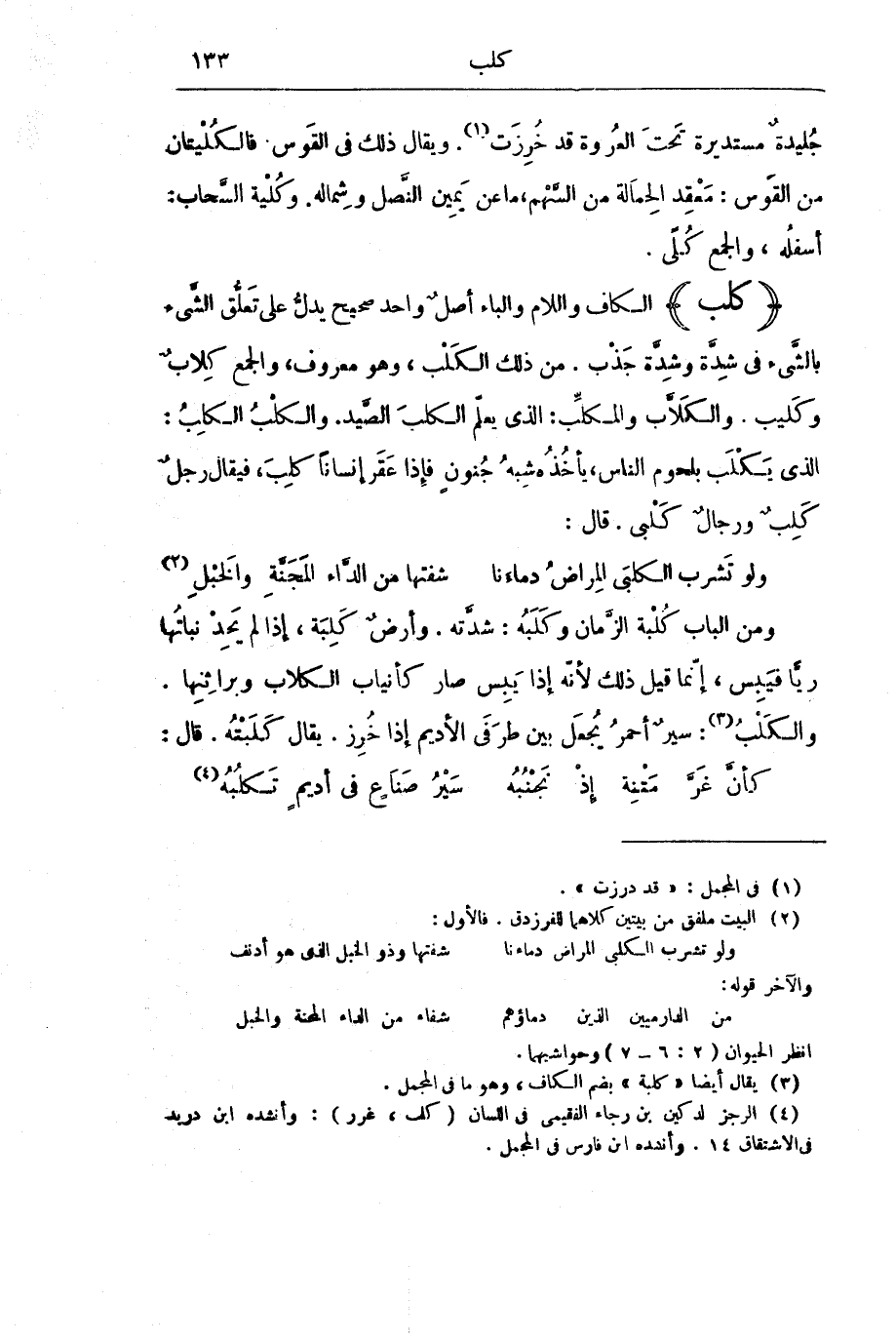 (كَلَبَ) الْكَافُ وَاللَّامُ وَالْبَاءُ أَصْلٌ وَاحِدٌ صَحِيحٌ يَدُلُّ عَلَى تَعَلُّقِ الشَّيْءِ بِالشَّيْءِ فِي شِدَّةٍ وَشِدَّةِ جَذْبٍ. مِنْ ذَلِكَ الْكَلْبُ، وَهُوَ مَعْرُوفُ، وَالْجَمْعُ كِلَابٌ وَكَلِيبٌ. وَالْكَلَّابُ وَالْمُكَلِّبُ: الَّذِي يُعَلِّمُ الْكَلْبَ الصَّيْدَ. وَالْكَلْبُ الْكَلِبُ: الَّذِي يَكْلَبُ بِلُحُومِ النَّاسِ، يَأْخُذُهُ شِبْهُ جُنُونٍ فَإِذَا عَقَرَ إِنْسَانًا كَلِبَ، فَيُقَالُ رَجُلٌ كَلِبٌ وَرِجَالٌ كَلْبَى. قَالَ: