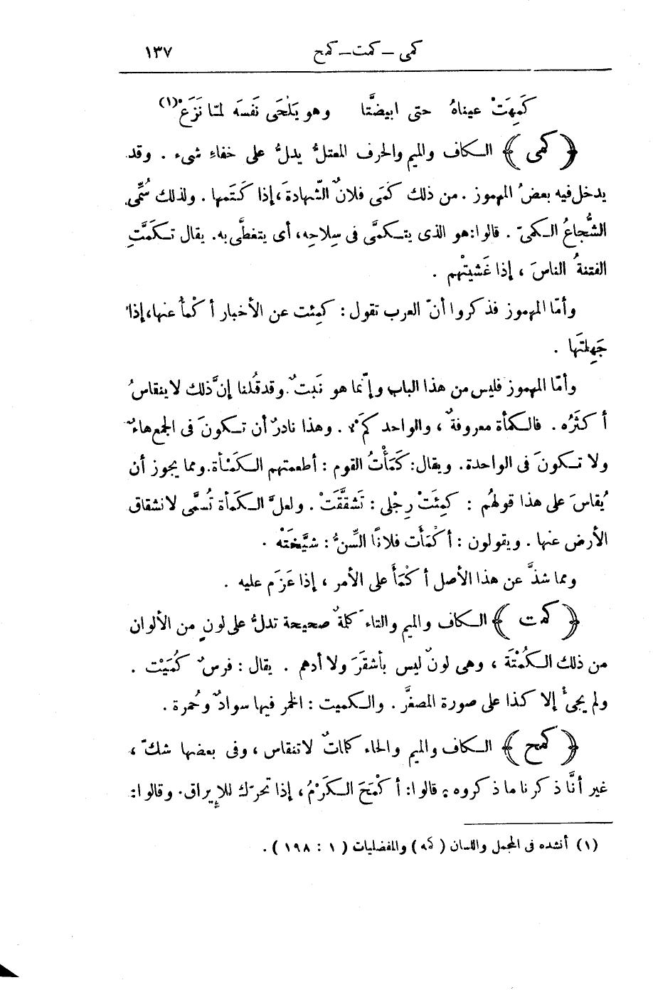 وَأَمَّا الْمَهْمُوزُ فَذَكَرُوا أَنَّ الْعَرَبَ تَقُولُ: كَمِئْتُ عَنِ الْأَخْبَارِ أَكْمَأُ عَنْهَا، إِذَا جَهِلْتَهَا.
