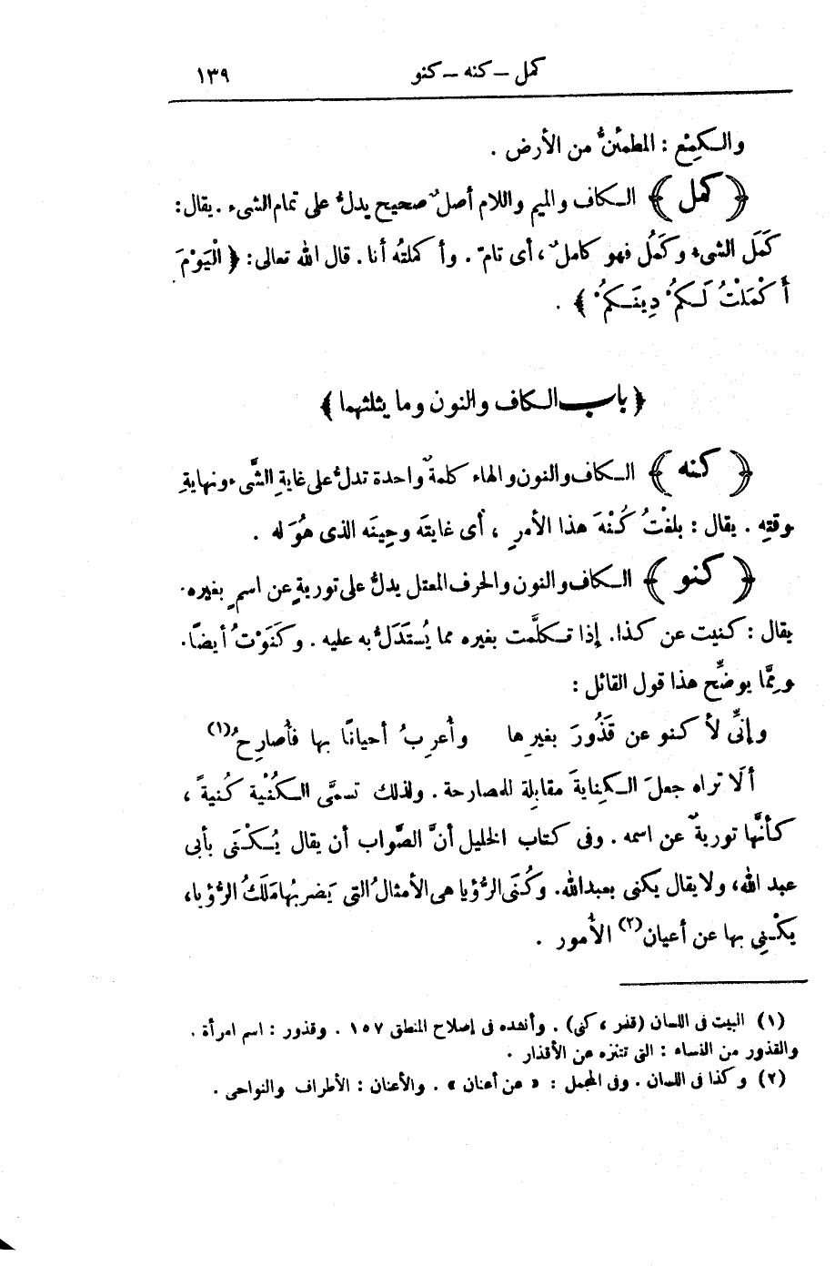 أَلَا تَرَاهُ جَعْلَ الْكِنَايَةَ مُقَابِلَةً لِلْمُصَارَحَةِ. وَلِذَلِكَ تُسَمَّى الْكُنْيَةُ كُنْيَةً، كَأَنَّهَا تَوْرِيَةٌ عَنِ اسْمِهِ. وَفِي كِتَابِ الْخَلِيلِ أَنَّ الصَّوَابَ أَنْ يُقَالَ يُكْنَى بِأَبِي عَبْدِ اللَّهِ، وَلَا يُقَالُ يُكَنَّى بِعَبْدِ اللَّهِ. وَكُنَى الرُّؤْيَا هِيَ الْأَمْثَالُ الَّتِي يَضْرِبُهَا مَلَكُ الرُّؤْيَا، يَكْنِي بِهَا عَنْ أَعْيَانِ الْأُمُورِ.