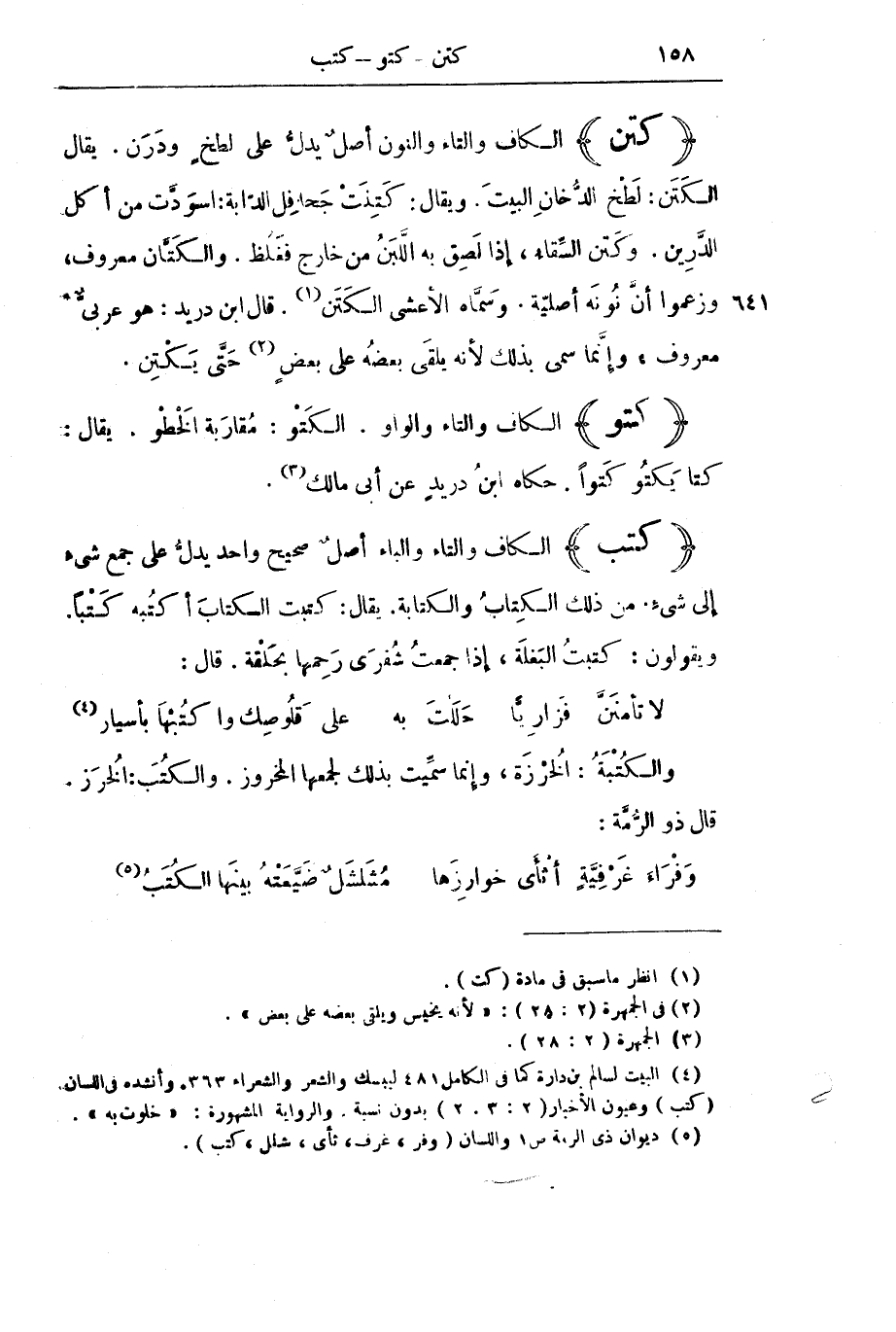 (كَتَبَ) الْكَافُ وَالتَّاءُ وَالْبَاءُ أَصْلٌ صَحِيحٌ وَاحِدٌ يَدُلُّ عَلَى جَمْعِ شَيْءٍ إِلَى شَيْءٍ. مِنْ ذَلِكَ الْكِتَابُ وَالْكِتَابَةُ. يُقَالُ: كَتَبْتُ الْكِتَابَ أَكْتُبُهُ كَتْبًا. وَيَقُولُونَ: كَتَبْتُ الْبَغْلَةَ، إِذَا جَمَعْتُ شُفْرَيْ رَحِمِهَا بِحَلْقَةٍ. قَالَ: