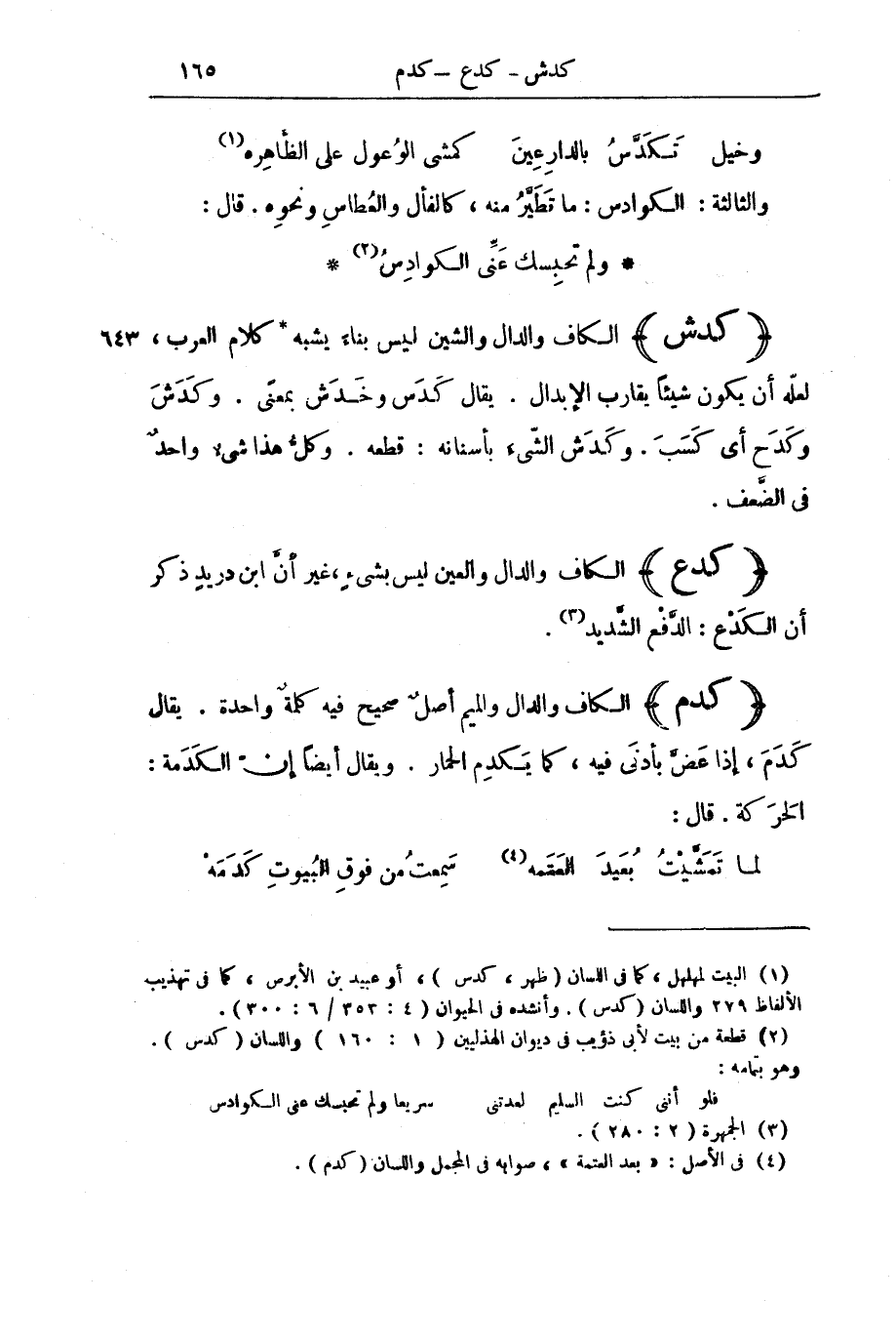 (كَدَشَ) الْكَافُ وَالدَّالُ وَالشِّينُ لَيْسَ بِنَاءً يُشْبِهُ كَلَامَ الْعَرَبِ، لَعَلَّهُ أَنْ يَكُونَ شَيْئًا يُقَارِبُ الْإِبْدَالَ. يُقَالُ كَدَسَ وَخَدَشَ بِمَعْنًى. وَكَدَشَ وَكَدَحَ أَيْ كَسَبَ. وَكَدَشَ الشَّيْءَ بِأَسْنَانِهِ: قَطَعَهُ. وَكُلُّ هَذَا شَيْءٌ وَاحِدٌ فِي الضَّعْفِ.