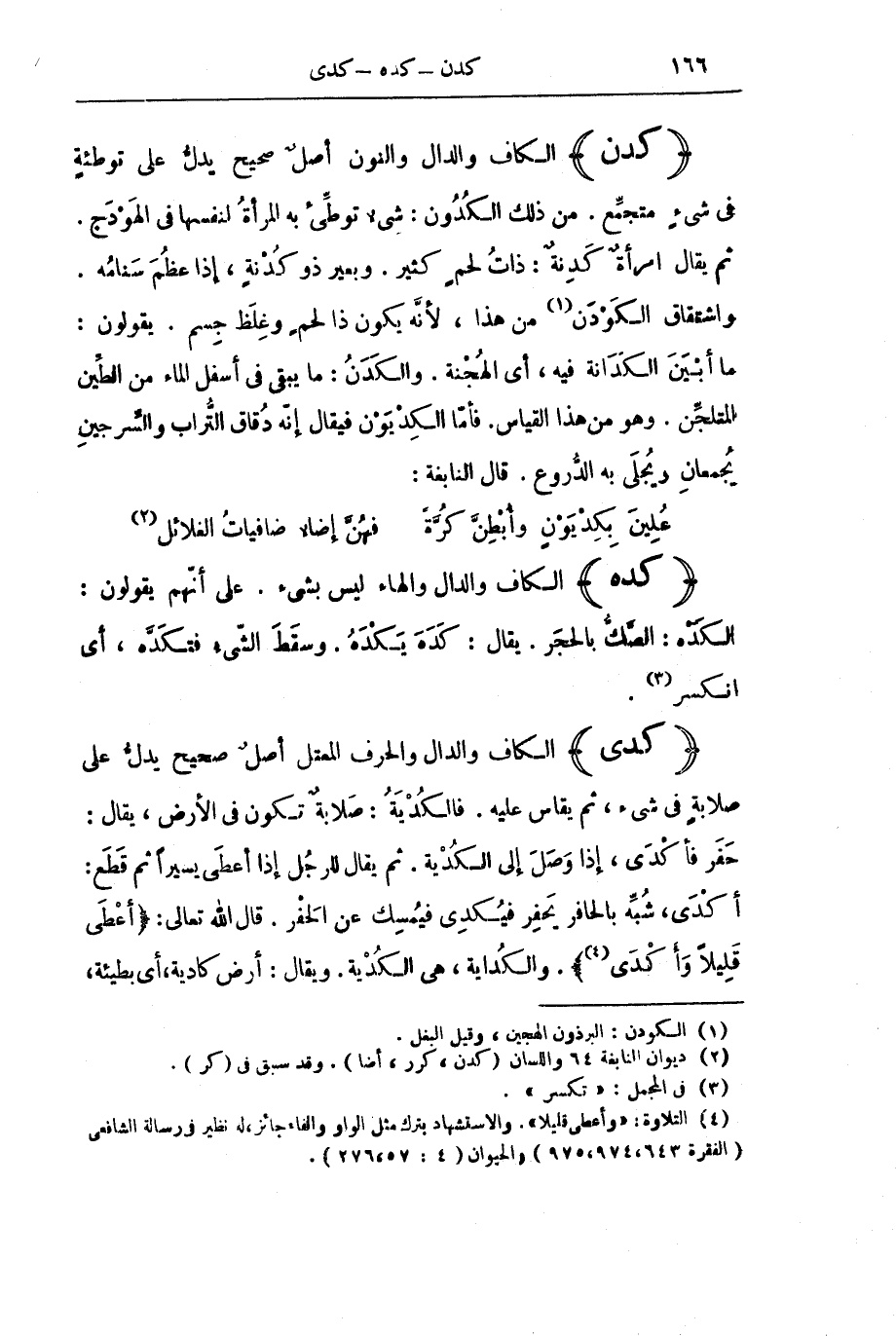 (كَدِيَ) الْكَافُ وَالدَّالُ وَالْحَرْفُ الْمُعْتَلُّ أَصْلٌ صَحِيحٌ يَدُلُّ عَلَى صَلَابَةٍ فِي شَيْءٍ، ثُمَّ يُقَاسُ عَلَيْهِ. فَالْكُدْيَةُ: صَلَابَةٌ تَكُونُ فِي الْأَرْضِ، يُقَالُ: حَفَرَ فَأَكْدَى، إِذَا وَصَلَ إِلَى الْكُدْيَةِ. ثُمَّ يُقَالُ لِلرَّجُلِ إِذَا أَعْطَى يَسِيرًا ثُمَّ قَطَعَ: أَكْدَى، شُبِّهَ بِالْحَافِرِ يَحْفِرُ فَيُكْدِي فَيُمْسِكُ عَنِ الْحَفْرِ. قَالَ اللَّهُ تَعَالَى: {وَأَعْطَى قَلِيلًا وَأَكْدَى} [النجم: 34] [النَّجْمِ 34] . وَالْكُدَايَةُ، هِيَ الْكُدْيَةُ. وَيُقَالُ: أَرْضٌ كَادِيَةٌ، أَيْ بَطِيئَةٌ،