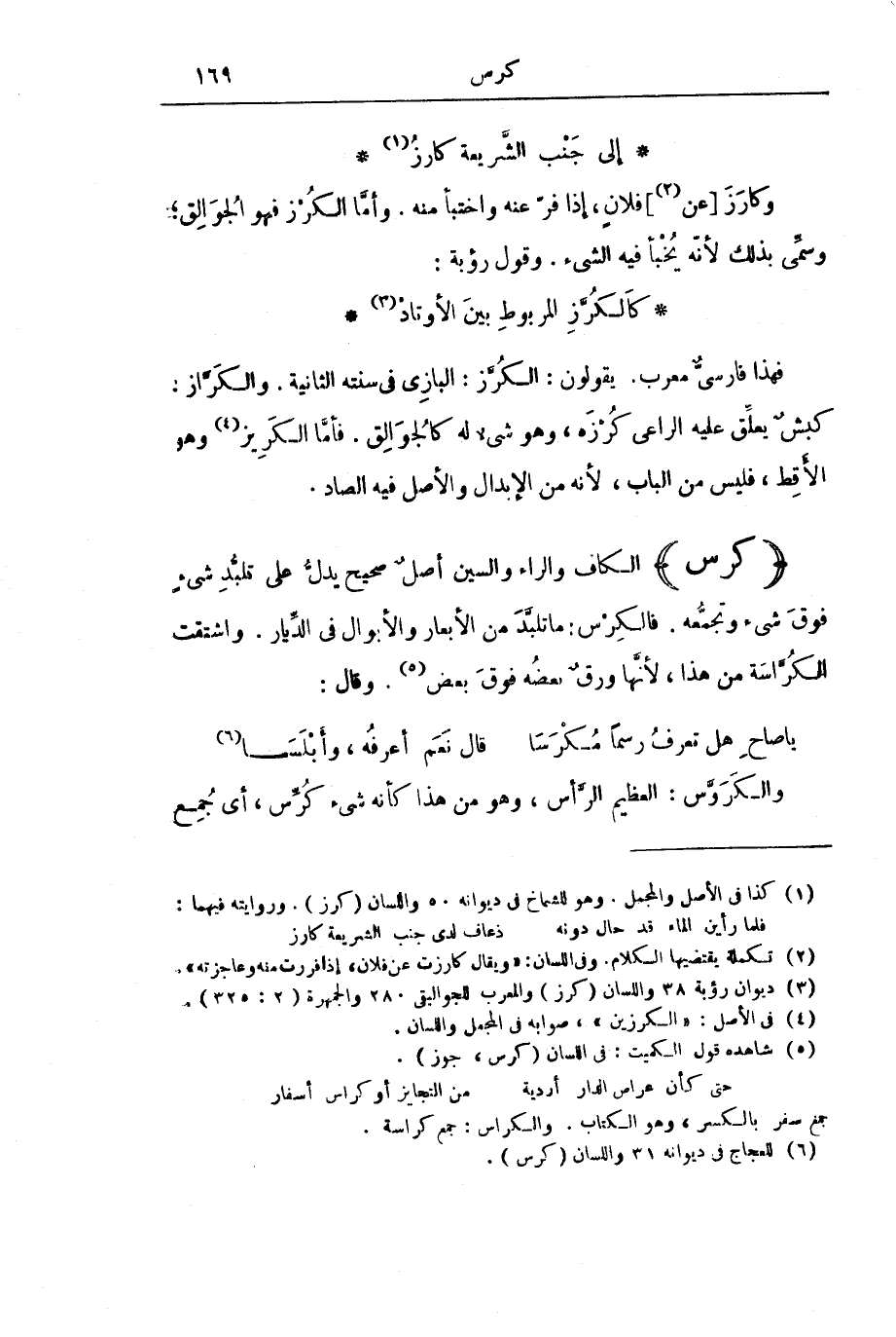 وَكَارَزَ [عَنْ] فُلَانٍ، إِذَا فَرَّ عَنْهُ وَاخْتَبَأَ مِنْهُ. وَأَمَّا الْكُرْزُ فَهُوَ الْجُوَالِقُ; وَسُمِّيَ بِذَلِكَ لِأَنَّهُ يُخْبَأُ فِيهِ الشَّيْءُ. وَقَوْلُ رُؤْبَةَ:
