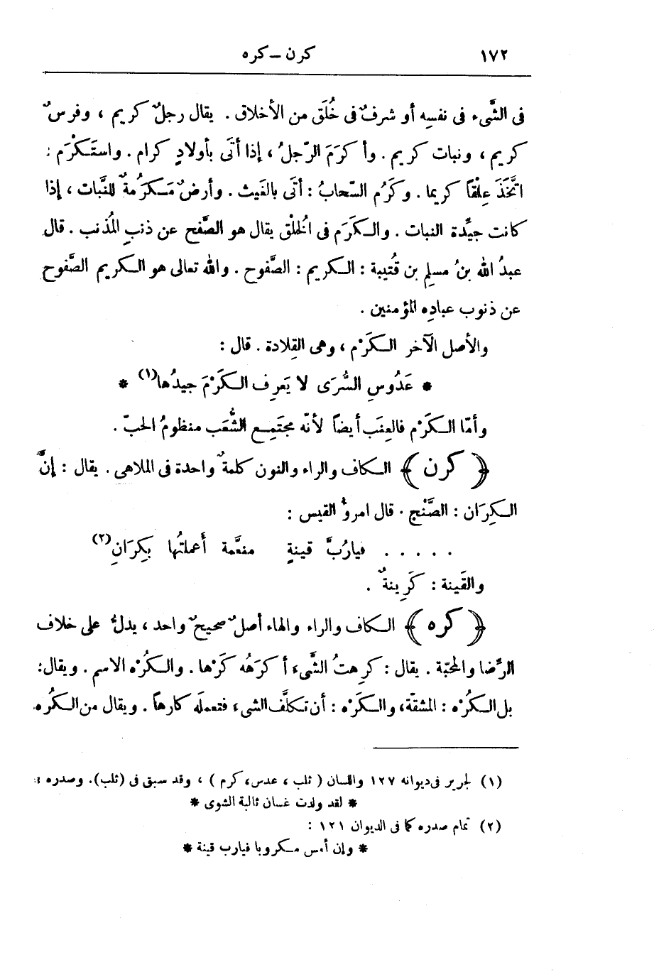 فِي الشَّيْءِ فِي نَفْسِهِ أَوْ شَرَفٌ فِي خُلُقٍ مِنَ الْأَخْلَاقِ. يُقَالُ رَجُلٌ كَرِيمٌ، وَفَرَسٌ كَرِيمٌ، وَنَبَاتٌ كَرِيمٌ. وَأَكْرَمَ الرَّجُلُ، إِذَا أَتَى بِأَوْلَادٍ كِرَامٍ. وَاسْتَكْرَمَ: اتَّخَذَ عِلْقًا كَرِيمًا. وَكَرُمَ السَّحَابُ: أَتَى بِالْغَيْثِ. وَأَرْضٌ مَكْرَُمَةٌ لِلنَّبَاتِ، إِذَا كَانَتْ جَيِّدَةَ النَّبَاتِ. وَالْكَرَمُ فِي الْخُلْقِ يُقَالُ هُوَ الصَّفْحُ عَنْ ذَنْبِ الْمُذْنِبِ. قَالَ عَبْدُ اللَّهِ بْنُ مُسْلِمِ بْنِ قُتَيْبَةَ: الْكَرِيمُ: الصَّفُوحُ. وَاللَّهُ تَعَالَى هُوَ الْكَرِيمُ الصَّفُوحُ عَنْ ذُنُوبِ عِبَادِهِ الْمُؤْمِنِينَ.