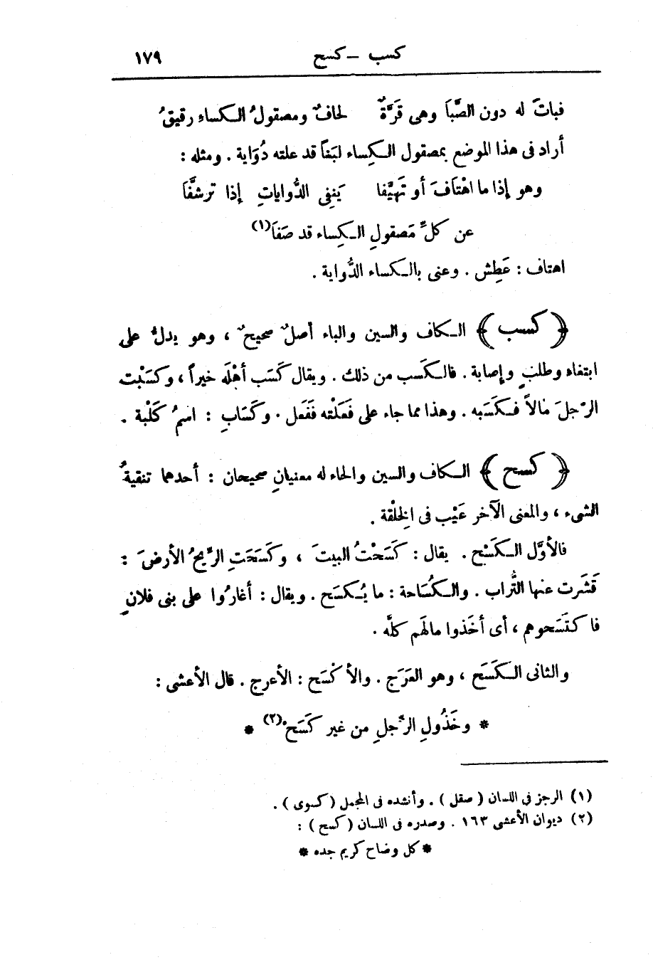 وَالثَّانِي الْكَسَحُ، وَهُوَ الْعَرَجُ. وَالْأَكْسَحُ: الْأَعْرَجُ. قَالَ الْأَعْشَى: