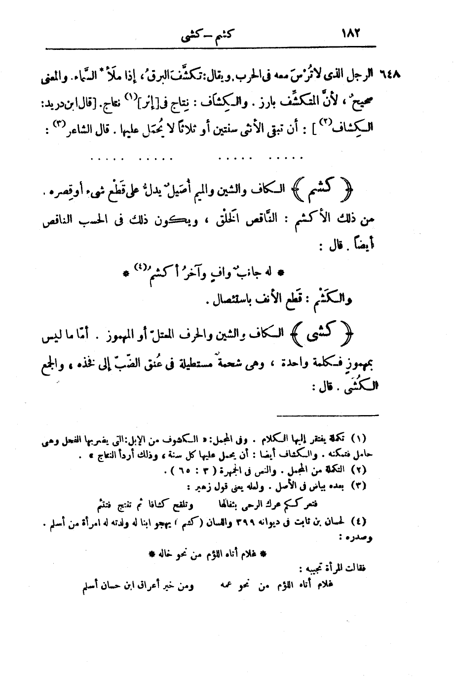 الرَّجُلُ الَّذِي لَا تُرْسَ مَعَهُ فِي الْحَرْبِ. وَيُقَالُ: تَكَشَّفَ الْبَرْقُ، إِذَا مَلَأَ السَّمَاءَ. وَالْمَعْنَى صَحِيحٌ، لِأَنَّ الْمُتَكَشِّفَ بَارِزٌ. وَالْكِشَافُ: نِتَاجٌ فِي [إِثْرِ] نِتَاجٍ. [قَالَ ابْنُ دُرَيْدٍ: الْكِشَافُ] : أَنْ تَبْقَى الْأُنْثَى سَنَتَيْنِ أَوْ ثَلَاثًا لَا يُحْمَلُ عَلَيْهَا. قَالَ الشَّاعِرُ:. . . . . . . . . . . . . . . . . . . . . . . . . . . . . . . . . . . . .