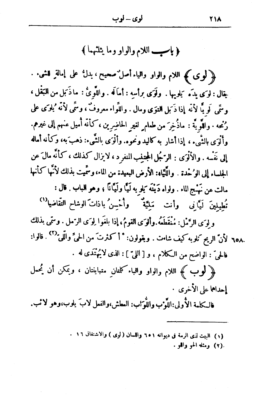 (لُوِيَ) اللَّامُ وَالْوَاوُ وَالْيَاءُ أَصْلٌ صَحِيحٌ، يَدُلُّ عَلَى إِمَالَةٍ لِلشَّيْءِ. يُقَالُ: لَوَى يَدَهُ يَلْوِيهَا. وَلَوَى بِرَأْسِهِ: أَمَالَهُ. وَاللَّوِيُّ: مَا ذَبَلَ مِنَ الْبَقْلِ، وَسُمِّيَ لَوِيًّا لِأَنَّهُ إِذَا ذَبَلَ الْتَوَى وَمَالَ. وَاللِّوَاءُ مَعْرُوفٌ، وَسُمِّيَ لِأَنَّهُ يُلْوَى عَلَى رُمْحِهِ. وَاللَّوِيَّةُ: مَا ذُخِرَ مِنْ طَعَامٍ لِغَيْرِ الْحَاضِرِينَ، كَأَنَّهُ أُمِيلَ عَنْهُمْ إِلَى غَيْرِهِمْ. وَأَلْوَى بِالشَّيْءِ، إِذَا أَشَارَ بِهِ كَالْيَدِ وَنَحْوِهِ. وَأَلْوَى بِالشَّيْءِ: ذَهَبَ بِهِ، وَكَأَنَّهُ أَمَالَهُ إِلَى نَفْسِهِ. وَالْأَلْوَى: الرَّجُلُ الْمُجْتَنِبُ الْمُنْفَرِدُ، لَا يَزَالُ كَذَلِكَ، كَأَنَّهُ مَالَ عَنِ الْجُلَسَاءِ إِلَى الْوُحْدَةِ. وَاللَّيَّاءُ، الْأَرْضُ الْبَعِيدَةُ مِنَ الْمَاءِ، وَسُمِّيَتْ بِذَلِكَ لِأَنَّهَا كَأَنَّهَا مَالَتْ عَنْ نَهْجِ الْمَاءِ. وَلَوَاهُ دَيْنَهُ يَلْوِيهِ لَيًّا وَلَيَّانًا، وَهُوَ الْبَابُ. قَالَ: